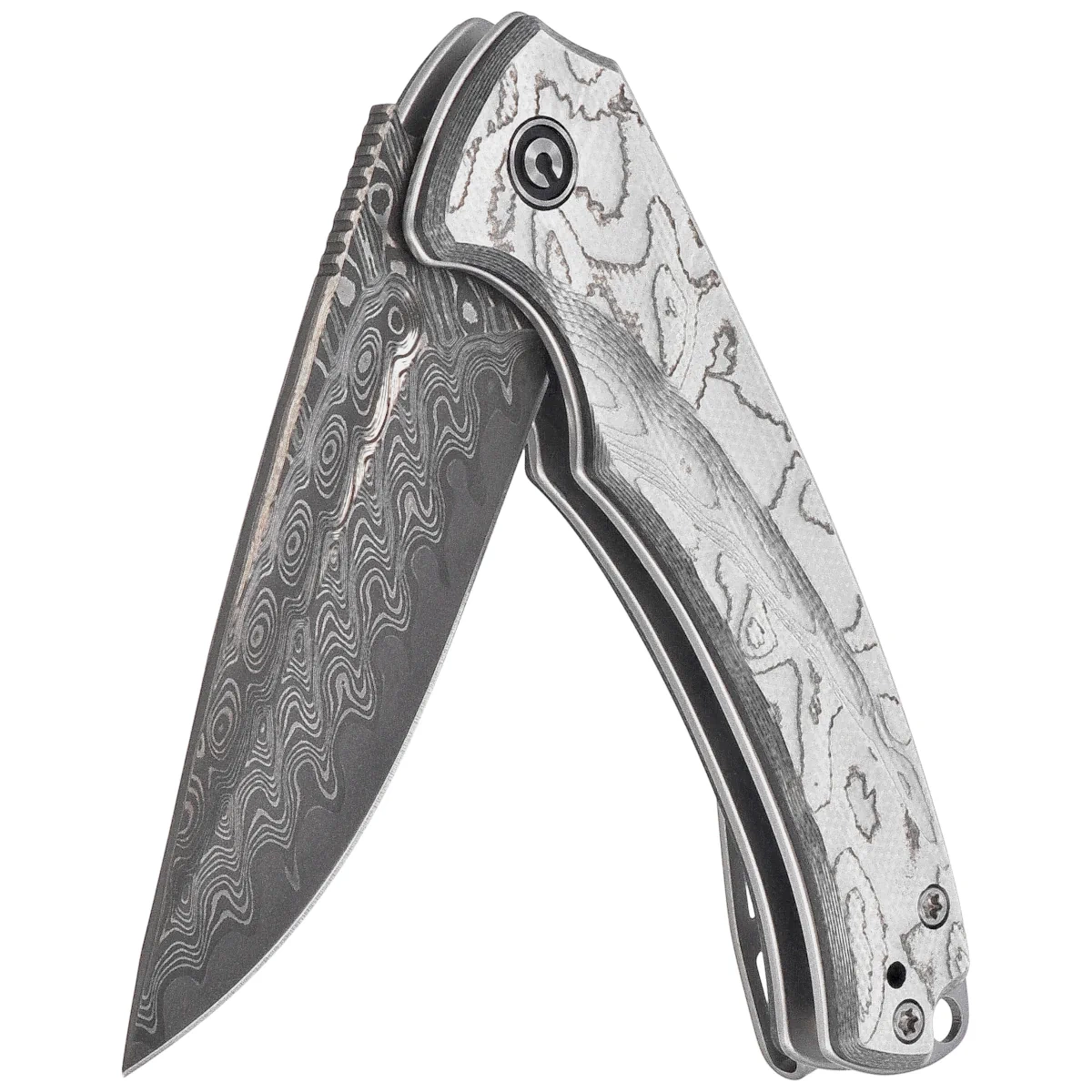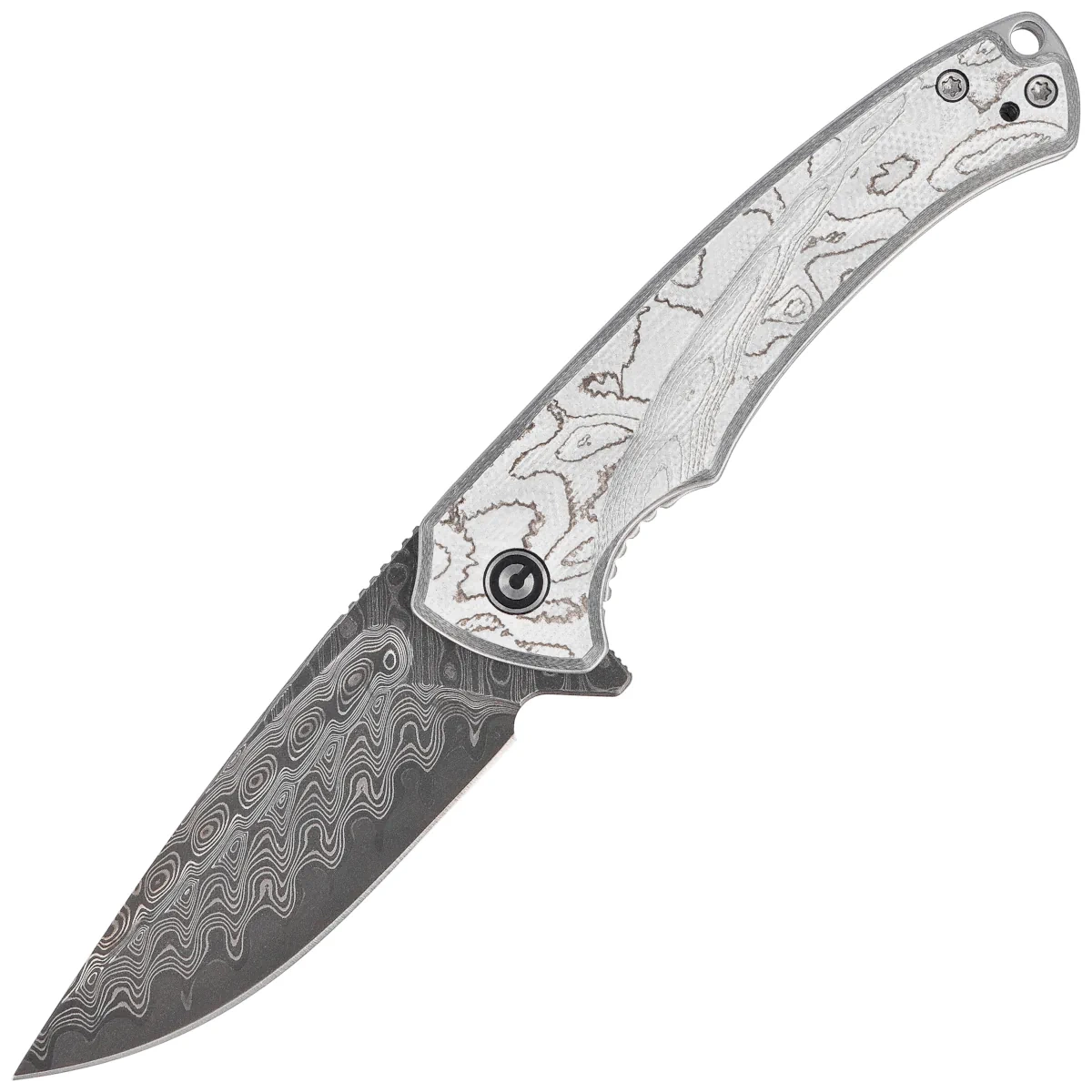 - Voidflare G10 w/ Aluminum Foil, Damascus - a sleek EDC folding knife with a sharp and durable damascus blade, set on a lightweight and textured G10 composite handle. Silver details and dynamic lines enhance the modern style.