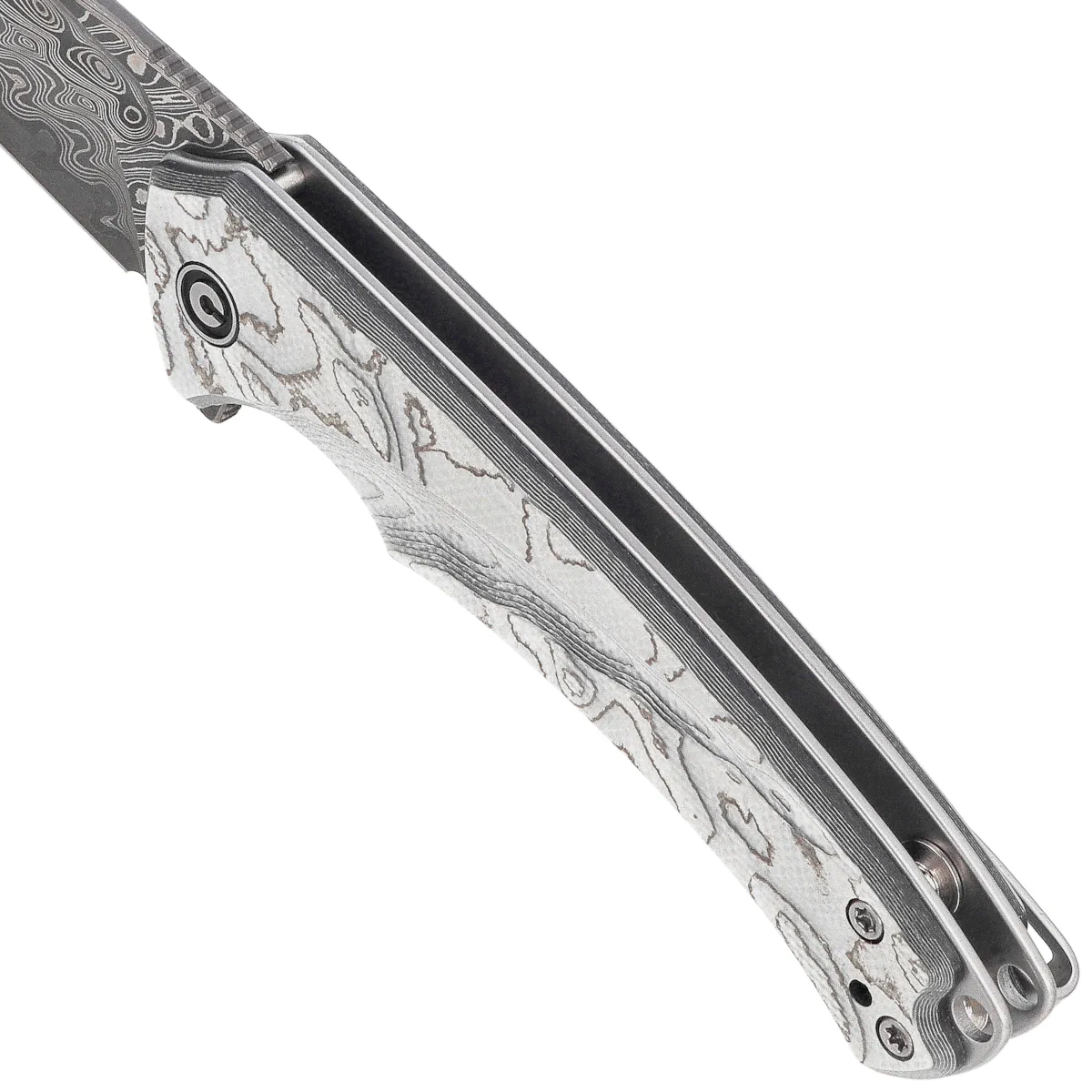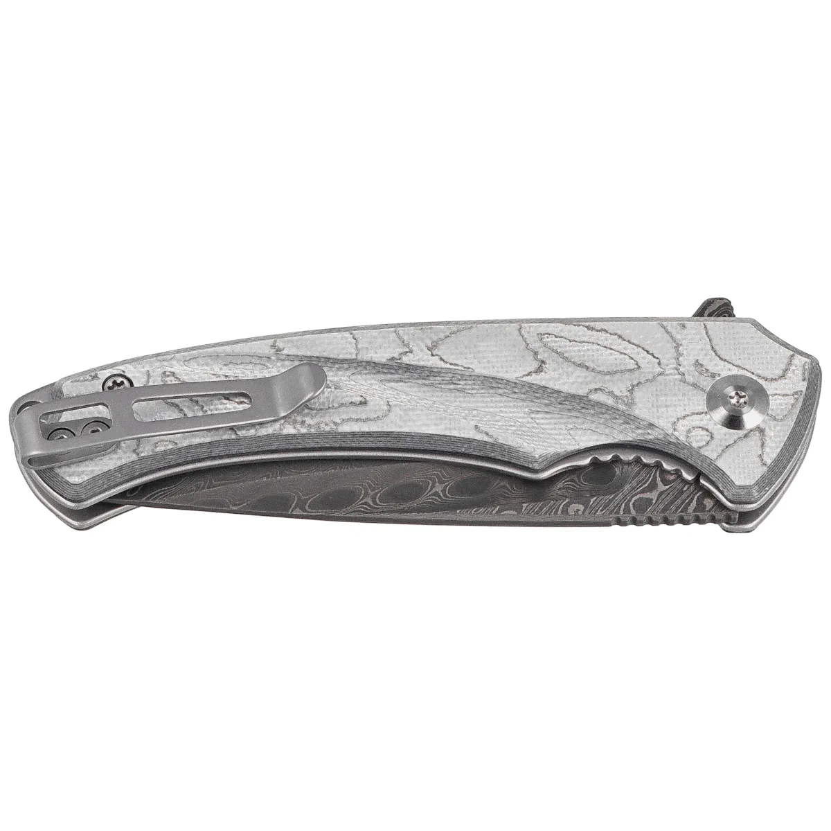 Blade - drop point type was made of durable stainless damast, offering good sharpness retention, resistance to rust and ease of sharpening. The hollow grind ensures precise blade guidance, and the acid etched finish highlights the steel's pattern line. Opening is done with a flipper, which, combined with ceramic bearings, guarantees velvety-smooth blade movement - no resistance, no noise, with immediate readiness for action.