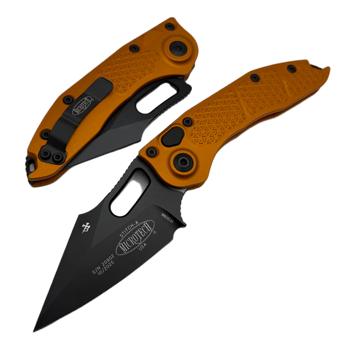 - Stitch-A S/E Orange Tangerine Aluminum, Black automatic version of the popular design by Sebastijan Berenjie of Borka Blades and Microtech. Wide harpoon-shaped blade, superior materials and legendary Microtech workmanship!