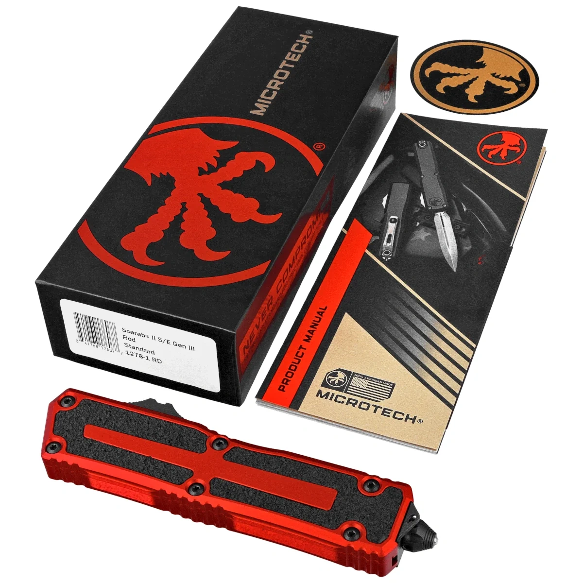 The Scarab II Gen III S/E Red Aluminum, Black is the pinnacle of excellence in automatic tactical knives, drawing inspiration from the original Microtech Ultratech design. Built to withstand the toughest conditions, the new Scarab II is the ultimate choice for heavy use. While retaining the styling features of its predecessor, it sets a new standard for OTF (Out The Front) technology.