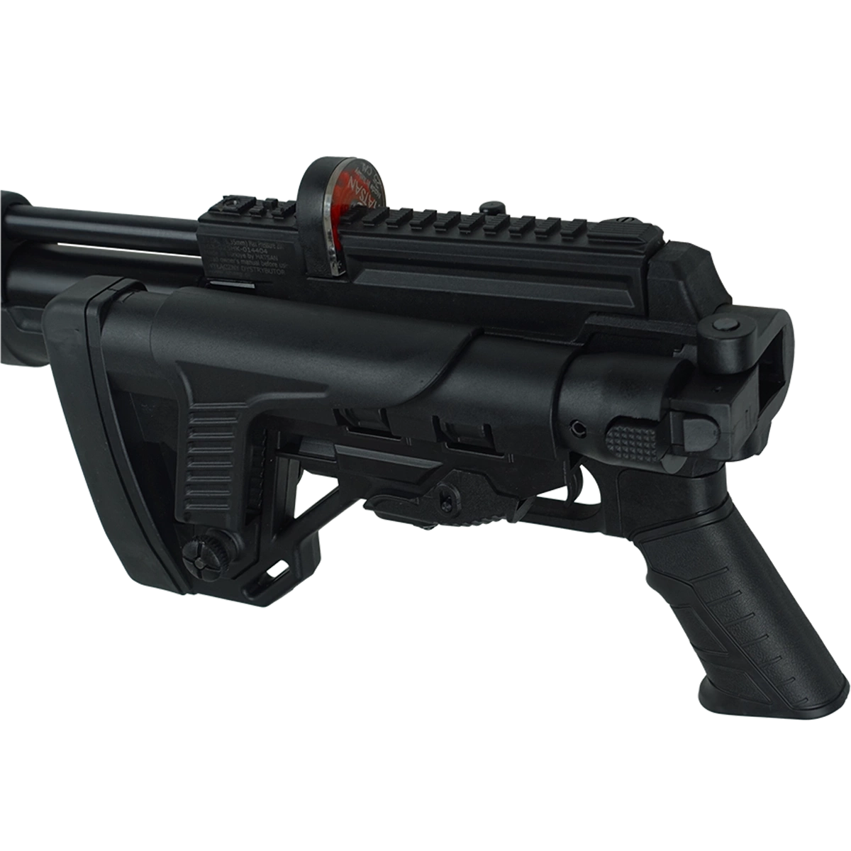 Stocktactical-style with a rubberized pistol grip and a fully adjustable AR-15-type buttstock. The telescopic stock features a vertically adjustable cheek rest and a rubberized butt pad. The side-folding design makes transport and storage more convenient. The rifle’s body is constructed from durable polymer.