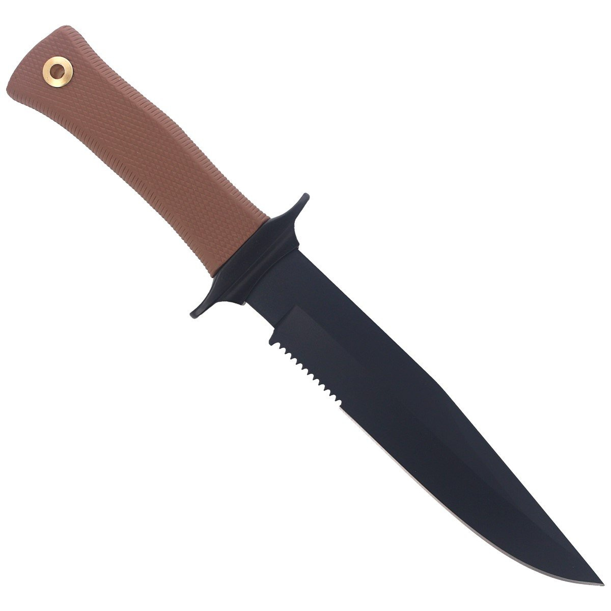 Rękojeść - pokryta elastyczną moletowaną okładziną z elastomeru w kolorze pustynnym. Miękka rękojeść z gumy gwarantuje bardzo dobrą przyczepność, nóż nie wyślizguje się z dłoni, a mocny i pewny uchwyt pozwala na wykonywanie precyzyjnych prac ostrzem. W tylnej części rękojeści powiększony otwór na linkę.