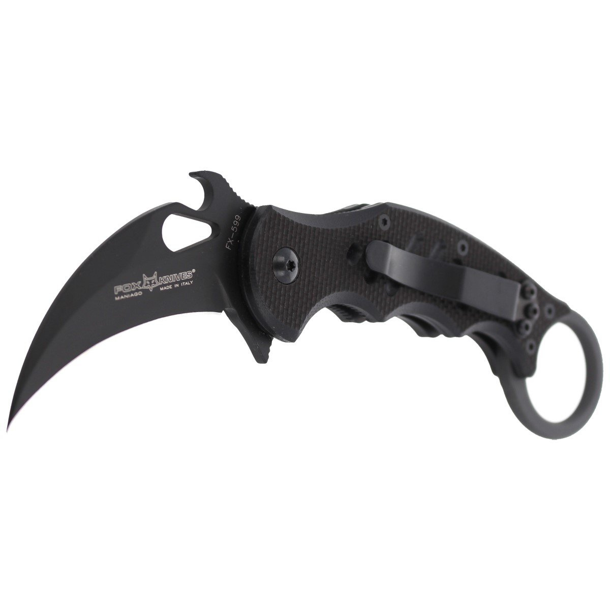 - FX-599 folder firmy FOX ukazuje jak bardzo ewoluowały pochodzące z Azji tradycyjne noże karambit. Pokryte powłoką Idroglider Black ostrze Hawkbill ze stali N690Co, klips Tip-Up, trzy systemy szybkiego otwarcia klingi hak Emerson, flipper i owalne wycięcie
