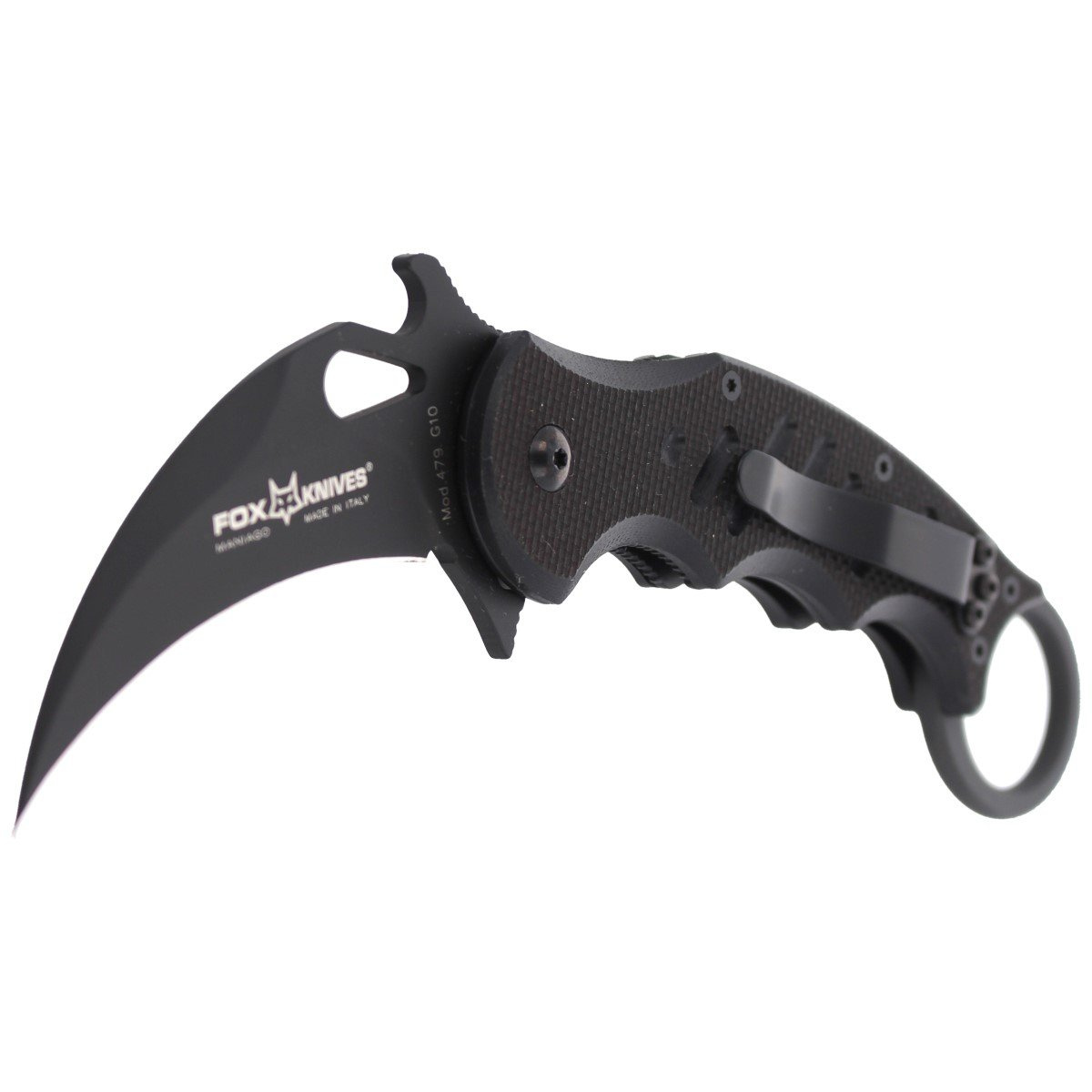 - 479, folder Fox ukazuje jak bardzo ewoluowały pochodzące z Azji tradycyjne noże karambit. Pokryte powłoką Idroglider Black ostrze Hawkbill ze stali Böhler N690Co, klips Tip-Up, trzy systemy szybkiego otwarcia klingi hak Emerson, flipper, owalne wycięcie