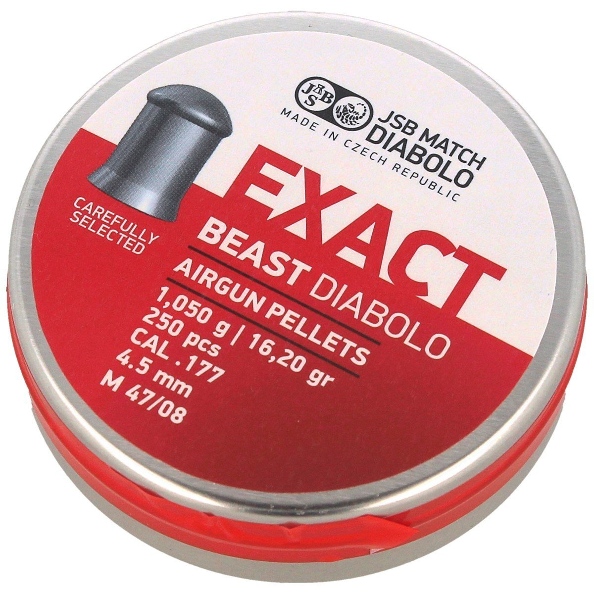 Diabolo Exact Beast - nadkalibrowy 4,52 mm, to najcięższy ze śrutów oferowanych przez firmę JSB. Wagę amunicji dobrano tak, aby pasował do karabinów pneumatycznych o największej mocy dostępnych na rynku. Uważany za śrut numer 1 przez posiadaczy mocnych wiatrówek FAC (bez limitu energii) oraz przez strzelców ceniących dużą moc oraz stabilność strzałów - bez względu na warunki pogodowe. Przeznaczony do strzelania na dużych dystansach, idealny do rozbijania celów, polowań, na zawody.
