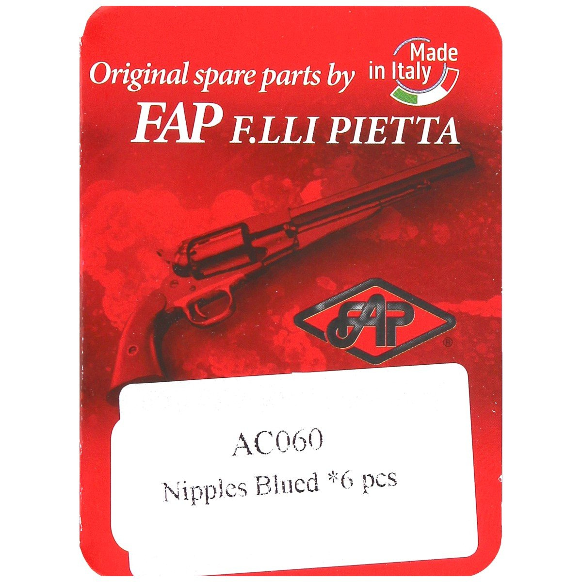 • AC060, komplet 6-ciu kominków (Nipples Blued) do rewolwerów czarnoprochowych Colt i Remington firmy Pietta Arms. Ważne! Podczas wymiany zaleca się nałożenie smaru miedziowego na gwint kominka w celu uniknięcia zapieczeń...