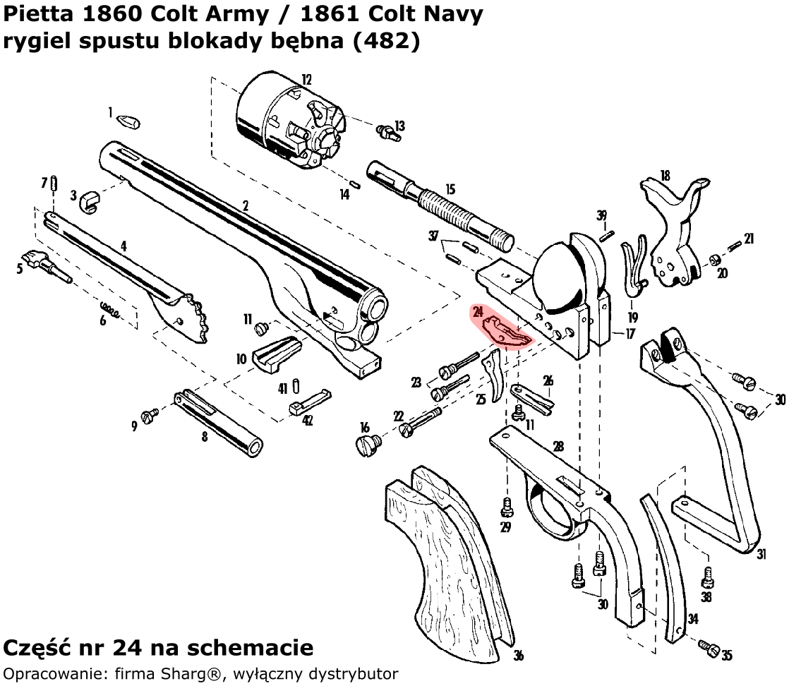 482 (serwis) rygiel spustu blokady bębna firmy Pietta. Do rewolweru czarnoprochowego 1851 Colt REB Nord Navy, 1860 Colt Army oraz 1861 Colt Navy.