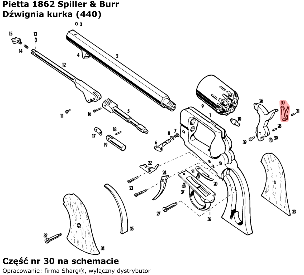 • 440 (serwis) dźwignia kurka ze sprężyną. Do rewolwerów czarnoprochowych 1858 Remington New Model Army /Navy, 1858 Remington New Model Army /Navy Stainless oraz 1862 Spiller & Burr firmy Pietta.