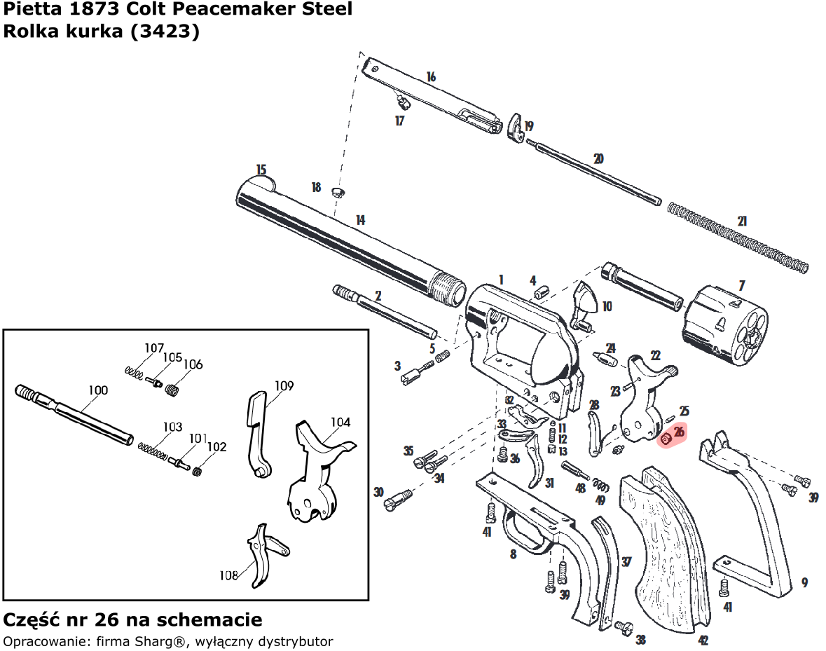 3423 (serwis) rolka kurka do rewolweru czarnoprochowego 1858 Remington New Model Army (.44 cal) / Navy (.36 cal) firmy Pietta. Pasuje również do modeli: 1862 Spiller & Burr, 1873 Single Action Steel, 1851 Colt Reb Nord Navy, 1860 Army oraz 1861 Navy