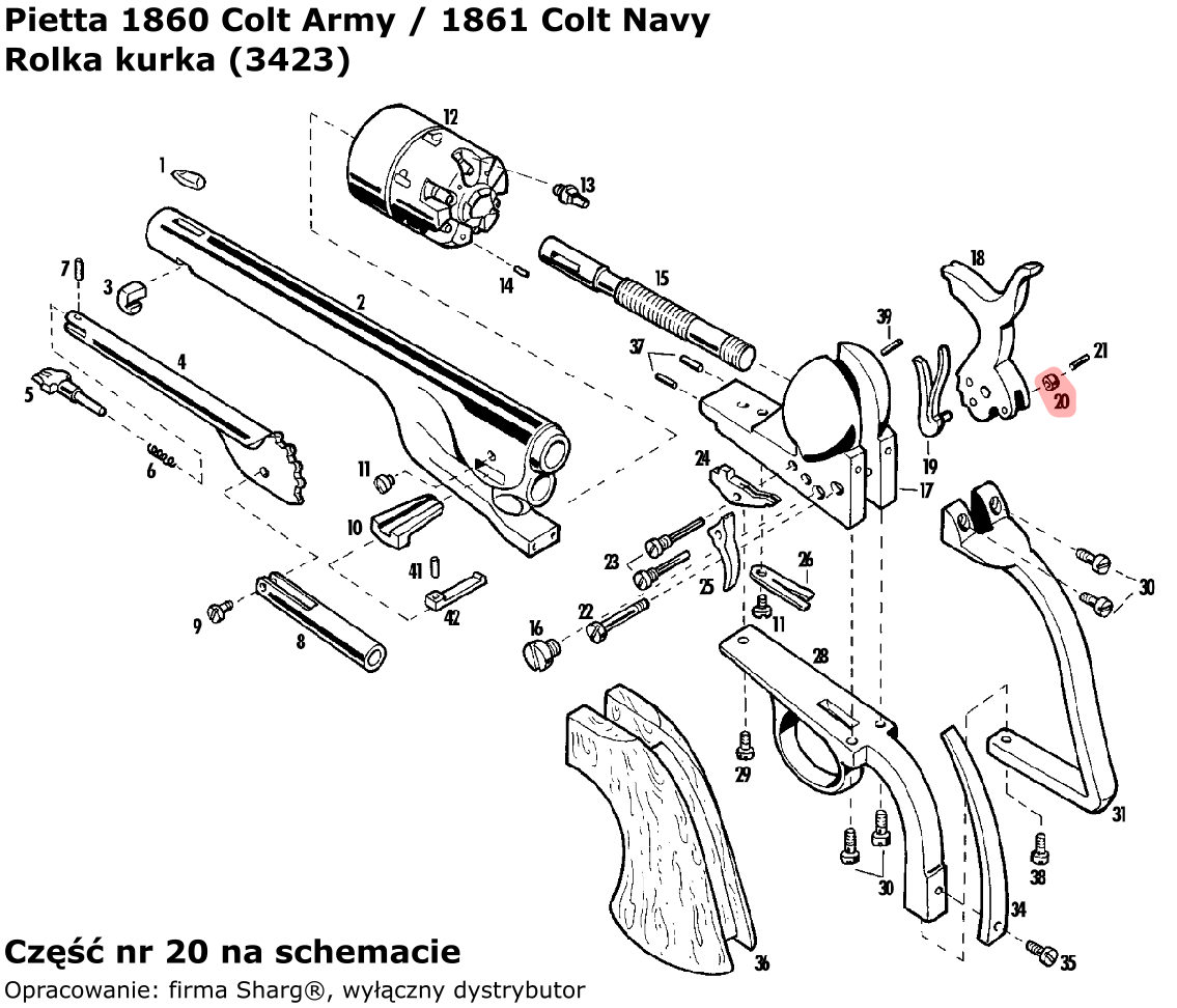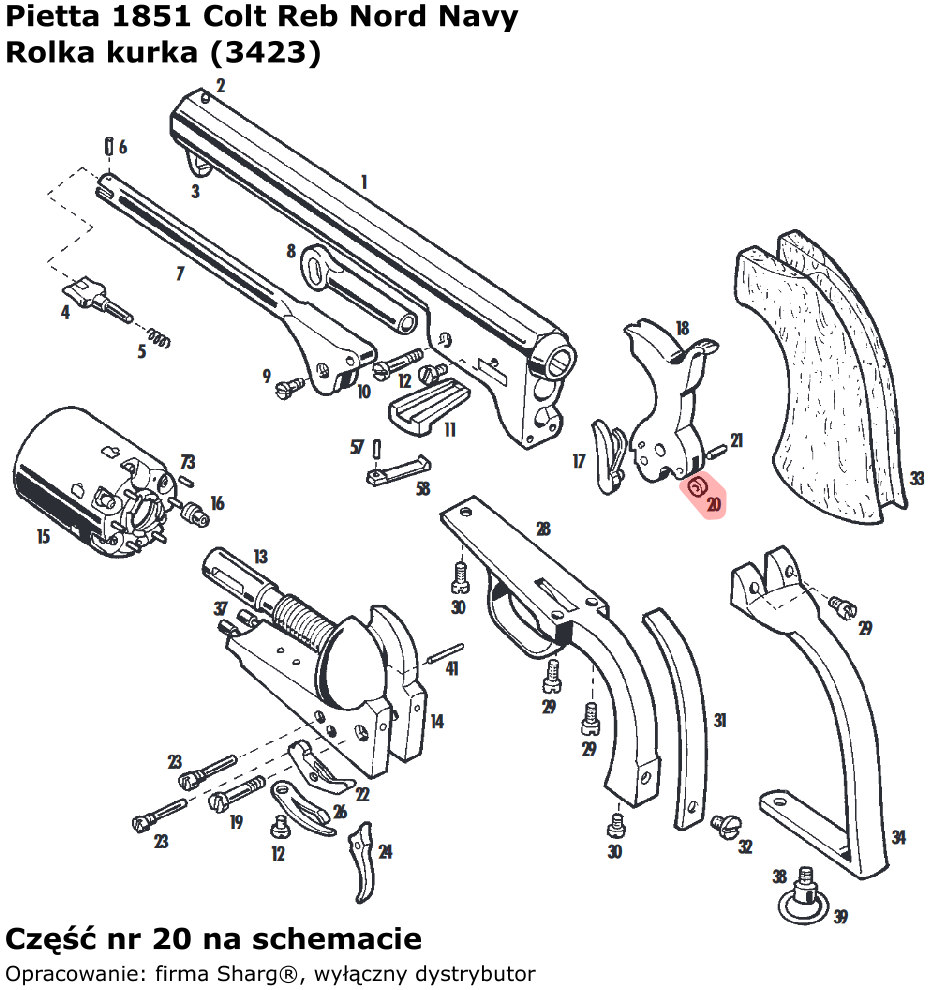 - 3423 (serwis) rolka kurka do rewolweru czarnoprochowego 1858 Remington New Model Army (.44 cal) / Navy (.36 cal) firmy Pietta. Pasuje również do modeli: 1862 Spiller & Burr, 1873 Single Action Steel, 1851 Colt Reb Nord Navy, 1860 Army oraz 1861 Navy...