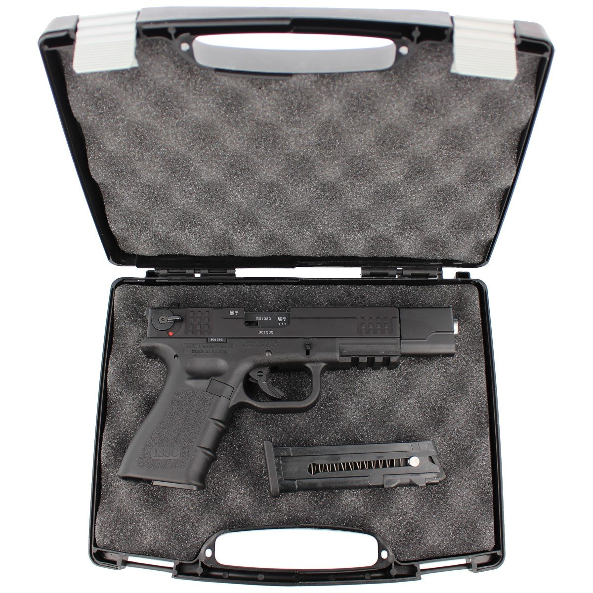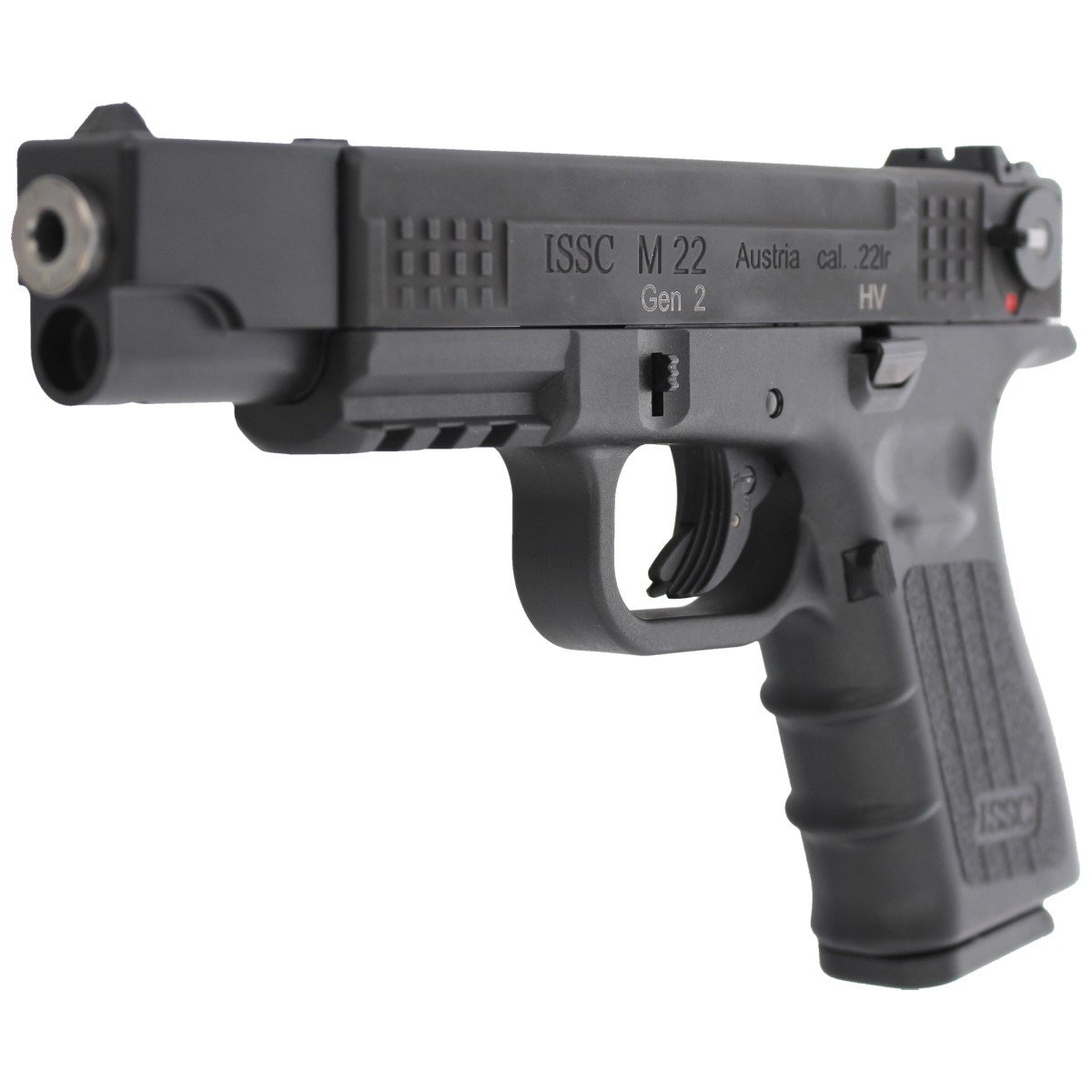 111002 - to już druga generacja (GEN-2) pistoletu małokalibrowego bocznego zapłonu austriackiej firmy ISSC - model z kompenstorem-obciążnikiem. M22 TARGET GEN-2 BLACK, nowoczesna broń zaprojektowana do treningu praktycznego oraz sportowego. Wyposażona w regulowane przyrządy celownicze (szczerbinka), mechanizm spustowy SA (Single Action) o charakterze sportowym, zasilana z jednorzędowego magazynka pudełkowego o pojemności 10 naboi.