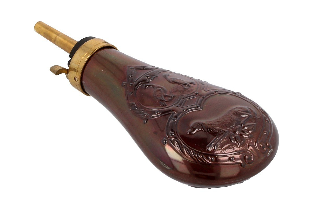 Remington Pattern Powder Flask .44 (030D529440) - prochownica z dozownikiem włoskiej firmy Davide Pedersoli. Zaprojektowana do rewolwerów czarnoporochowych Remington firmy Pietta i Uberti w kalibrze .44. Naważka prochu 24 grain. Prochownica z motywem myśliwskim przedstawiająca psa i 2 bażanty. Wykonana z lakierowanej miedzi oraz dozownikiem z mosiądzu.