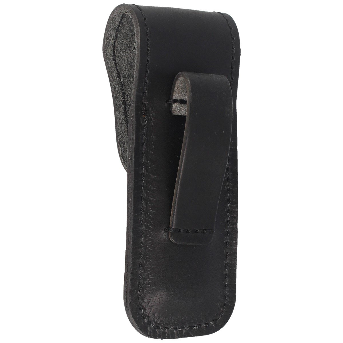 Etui - zapinane na zatrzask typu Prym. Wykonane z wysokiej jakości naturalnej skóry w kolorze czarnym z tłoczonym logo producenta. Pochwa posiada mocowanie do pasa lub oporządzenia umożliwiające przenoszenie noża w pozycji pionowej.