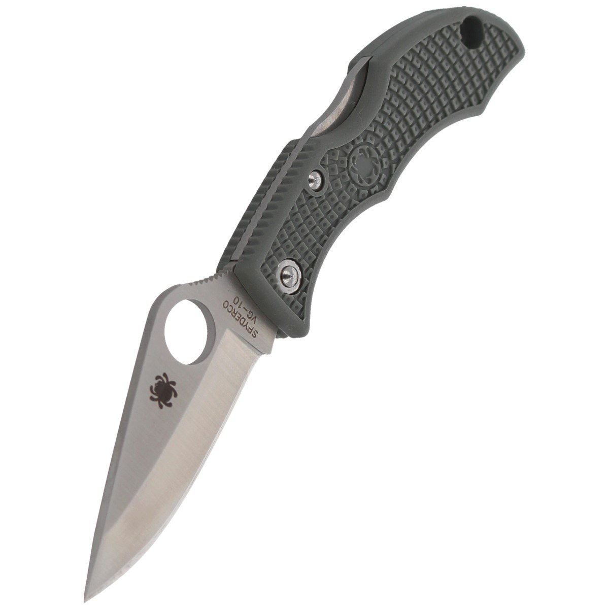 Głownia - o zmodyfikowanym profilu Clip Point, grubości 2 mm, wykonana z japońskiej nierdzewnej stali VG-10 (łatwej do naostrzenia, dobrze trzymającej ostrość). Klinga hartowana w przedziale 59-61 HRC. Powłoka Satin Finish (pół-mat) eliminuje odblaski. Ostrze gładkie Plain wyprowadzono szlifem płaskim (Saber Grind). Okrągłe wycięcie SpyderHole (patent Spyderco) umożliwia otwarcie noża kciukiem. Solidny Back-Lock z wycięciem Boye Detent, zapobiegającym przed przypadkowym zwolnieniem blokady przy mocnym uchwyceniu noża. Karbowana rampa pod kciuk.