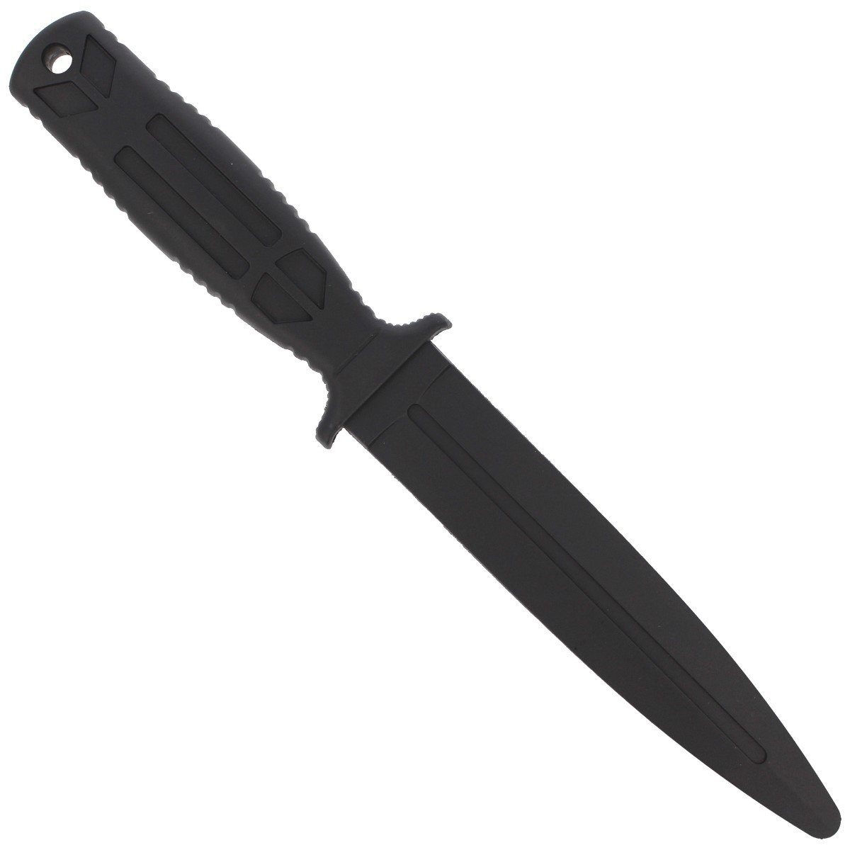 Contact Trainer Knife Dagger, bezpieczny nóż treningowy wykonany z miękkiej gumy w kolorze czarnym. Doskonały do treningu samoobrony, sztuk walki. Szczególnie przydatny podczas nauki technik samoobrony przed atakiem nożem czy różnego rodzaju pokazów z udziałem początkujących adeptów sztuk walki. W tylnej części rękojeści znajduję się otwór umożliwiający montaż linki zabezpieczającej.