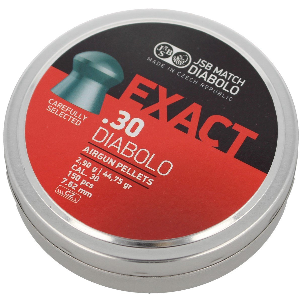 Diabolo Exact .30 (2.9 g) ciężki śrut JSB w kal. 7,62 mm. Opracowany we współpracy z czołowymi producentami, został stworzony z myślą o karabinach o mocy powyżej 16 J, dzięki czemu doskonale sprawdza się w mocnych wiatrówkach FAC (bez limitu energii), osiągających od 70 J do nawet 150 J i więcej. To wyjątkowy, bardzo precyzyjny pocisk zapewniający dużą siłę obalającą, świetną celność, przeznaczony do strzelania na duże dystanse. Idealnie nadaje się do rozbijania celów oraz do polowań. Wysoka jakość wykonania gwarantuje świetną celność i doskonałą powtarzalność strzałów.