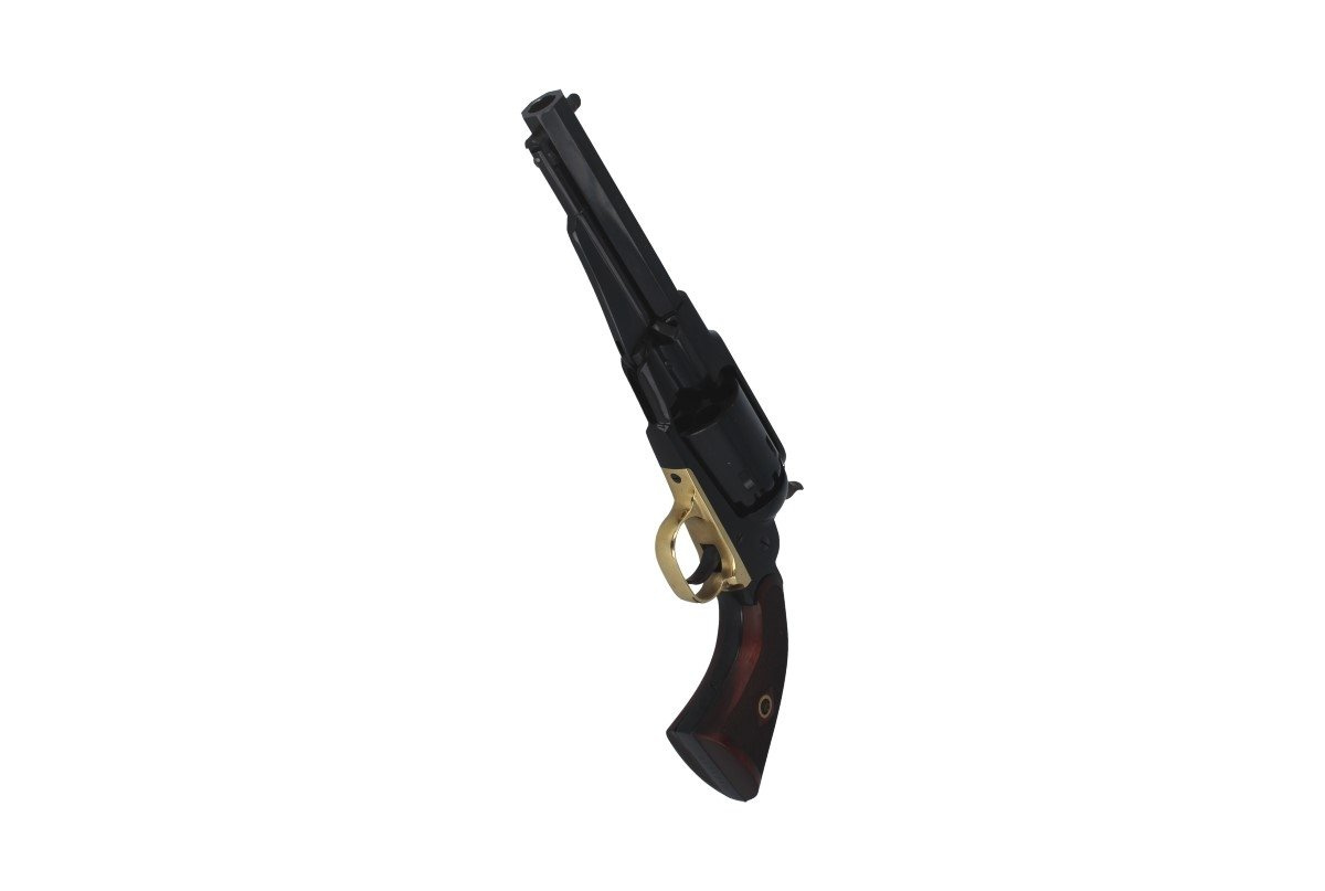 - 1858 Remington Texas Sheriff .44 moletowany chwyt. 6-ciostrzałowy ładowany odprzodowo kapiszonowy rewolwer czarnoprochowy w kal .44. Rewolwer z zamkniętym szkieletem (o większej sztywności) umożliwiającym wyjęcie bębna i założenia nowego, już załadowanego