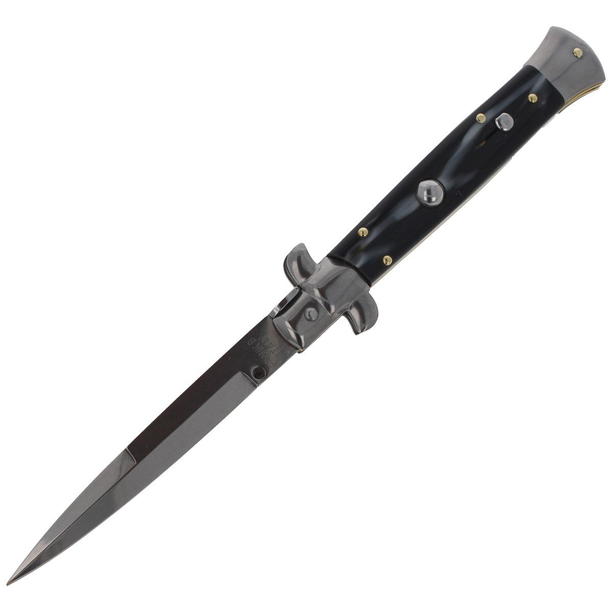 Classic Italian Stiletto Imit. Horn Bayonet 23 cm, tradycyjny włoski nóż sprężynowy. Ręcznie wykonane zgodnie z zasadami włoskiego rzemiosła, noże Frank Beltrame Stiletto stały się sławne na całym świecie dzięki swej skrajnej lekkości i wytrzymałości. Dzięki swoim właściwościom, włoski sztylet jest odpowiedni do zastosowania w każdym środowisku, od polowania do biwakowania. Solidna, wytrzymała konstrukcja, mocna otwierająca głownię sprężyna, to cecha klasycznych włoskich noży sprężynowych Frank Beltrame.