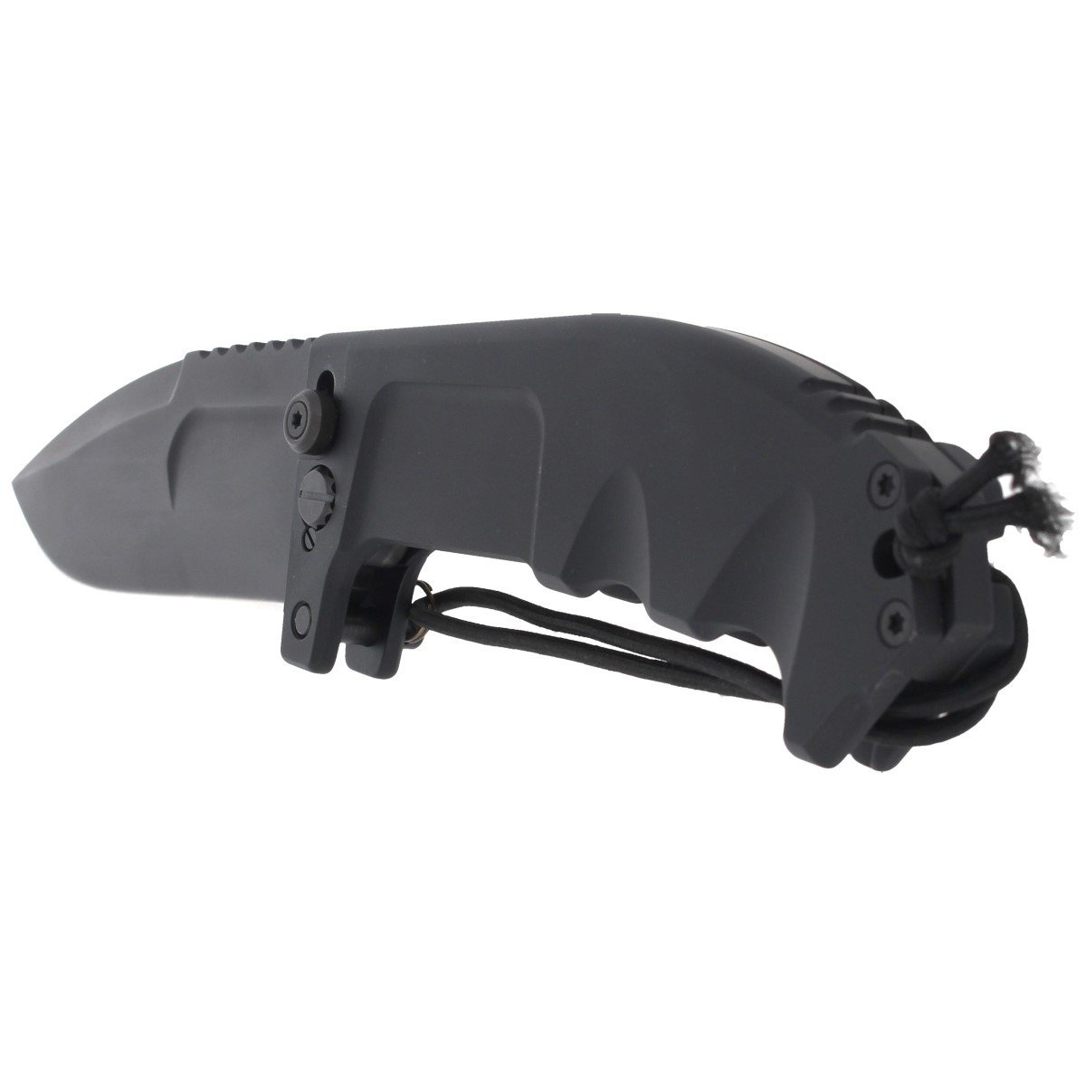 Rękojeść - pełnowymiarowa, jak w nożach combat. Okładziny chwytu z anodyzowanego aluminium gwarantującą pewny chwyt mokrymi dłońmi jak i w rękawicy. Pełne linersy ze stali nierdzewnej. W tylnej części chwytu lanyard hole, otwór z przeciągniętą elastyczną linką z zamocowanym stalowym sworzniem. Dodatkowe karbowane nacięcia spine jimping na grzbiecie rękojeści dla użytkowników ceniących odwrócony chwyt. Stalowa głowica może pełnić funkcję zbijaka do bicie szyb i nie tylko...