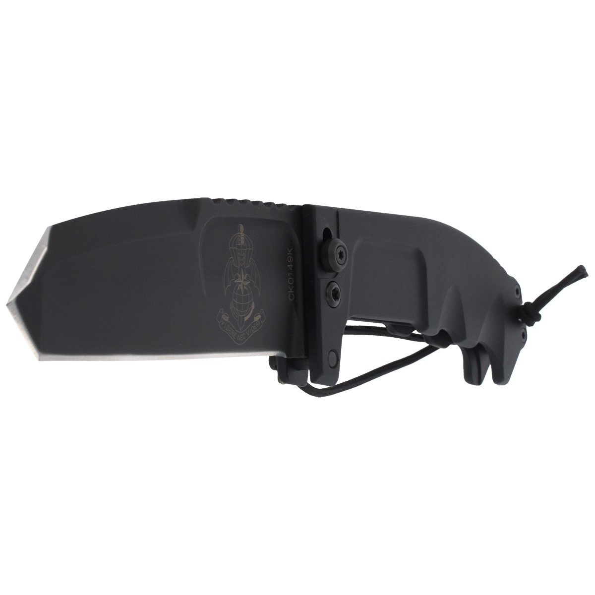 Głownia - masywna o grubości 6 mm i niezwykle ostra z krótkim fałszywym ostrzem i kształtem Tanto zapewnia doskonałą geometrię krawędzi tnącej przy niskim tarciu. Klingę pokryto nierefleksyjną matową powłoką MIL-C-13924 BURNISHING. Gładkie ostrze Plain wyprowadzono szlifem płaskim (Flat grind). Na grzbiecie klingi długa karbowana rampa pod kciuk (spine jimping) ułatwia sprawne operowanie nożem.