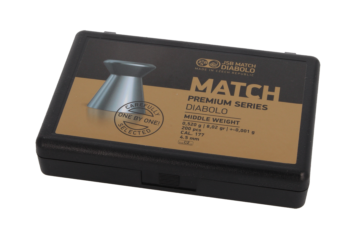 - Match Premium Series Middle (0.520 g) nadkalibrowy, karabinowy śrut tarczowy z płaskim czołem kal 4,52mm. Selekcjonowany do precyzyjnego strzelania sportowego dla wyczynowych strzelców. Gładki kielich, bez moletowania. Oddzielnie pakowana każda ze śrucin.