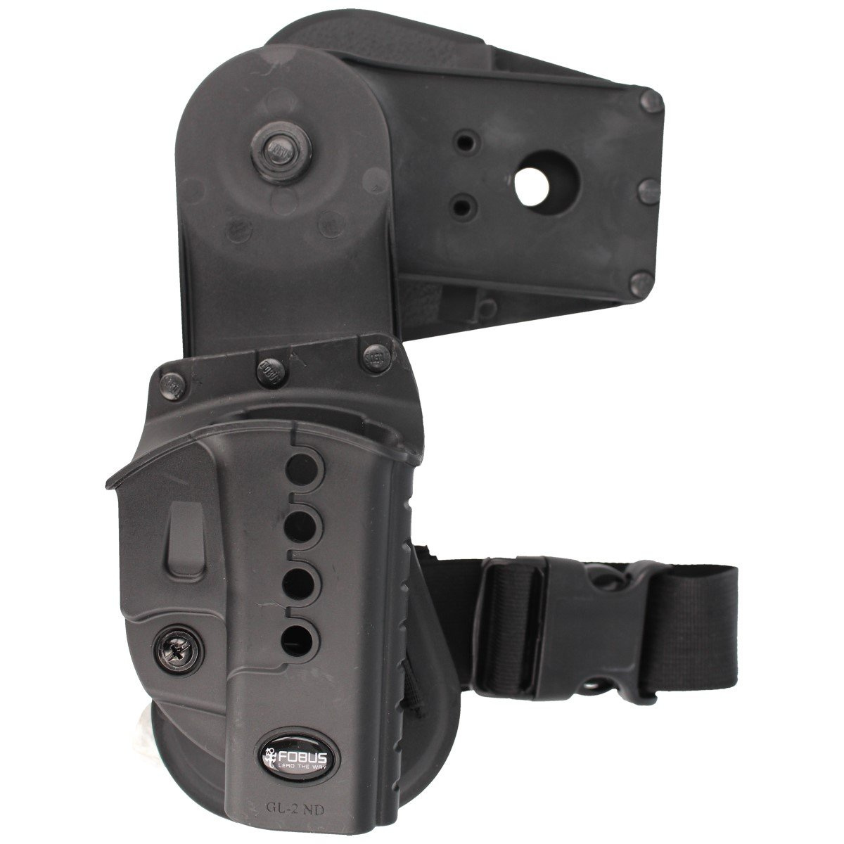 - GL-2 ND EX (Thigh Rig) kabura Fobus (Roto) z panelem udowym prawa. Do Glock: 17, 19, 22, 23, 31, 32, 34, 35,41. ND/Evolution-2 kabura z dodatkową śrubą regulującą siłę docisku kabury. Wpływa to na siłę z jaką broń jest trzymana w kaburze lub jest dobywana