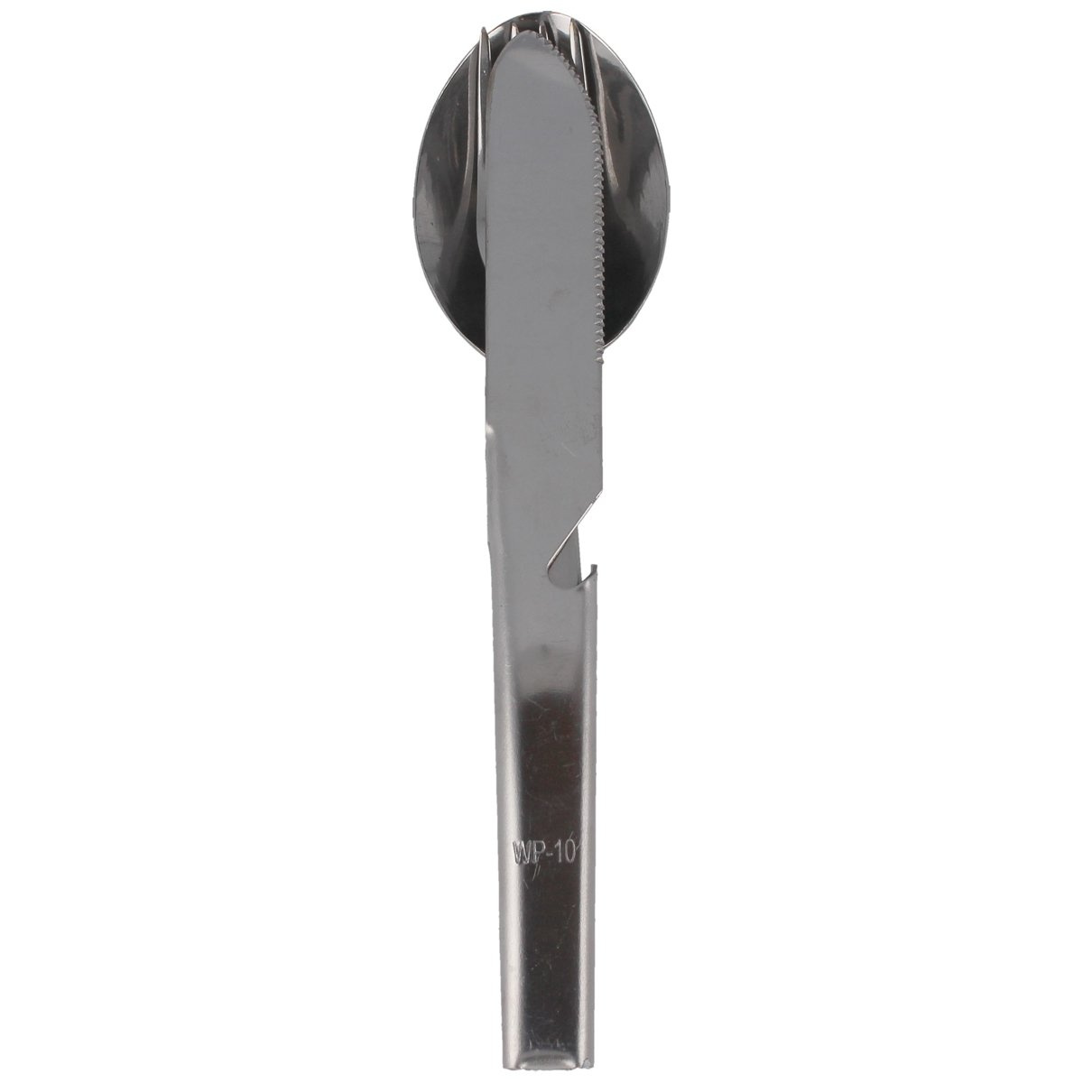 Klasyczny, łatwy do złożenia zestaw zawierający łyżkę, widelec oraz nóż z piłą. Dodatkowo nóż posiada otwieracz do kapsli oraz konserw, można używać go jako rączki do polskiej menażki wojskowej - co zapobiega poparzeniu od gorącego naczynia. Po złożeniu zestawu (wewnątrz okładzin noża) niezbędnik zajmuje niewiele miejsca. Poręczny i wytrzymały, wykonany z łatwej w utrzymaniu w czystości polerowanej stali nierdzewnej.