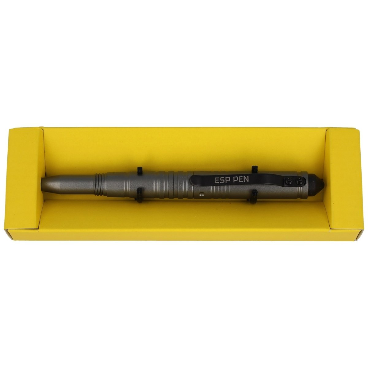 KBT-03-T kompaktowy, lekki długopis taktyczny firmy ESP w kolorze tytanu ze zbijakiem do bicia szyb. Ukryty wewnątrz gumowej stożkowej głowicy twardy kolec/zbijak do bicia szyb wykonano z węglika wolframu.