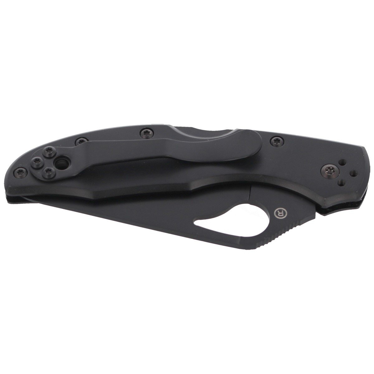 Głownia - typu Drop Point zapewnia doskonałą geometrię krawędzi tnącej przy niskim tarciu. Ostrze pokryte wytrzymałą matową powłoką proszkową black oxide coating, wyprowadzono szlifem pełnym płaskim (Full Flat Grind). Karbowany grzbiet głowni, rampa ustawia kciuk oraz daje solidne podparcie, a łukowate podcięcie pod palec wskazujący między rękojeścią a krawędzią tnącą (finger choil jimping) ułatwia operowanie folderem. Wycięcie w kształcie komety Comet-shaped (patent Spyderco) do szybkiego otwarcie klingi. Blokada głowni Back-Lock z zabezpieczeniem przed przypadkowym zwolnieniem blokady, wycięcie w blokadzie projektu Davida Boye'a.