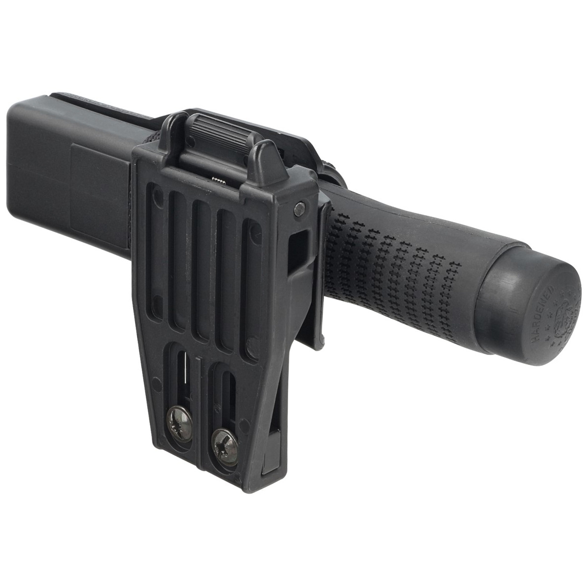 UBC-05 - (Quick Change System) uniwersalne mocowanie na pas wsuwane. Pozwala na szybką wymianę uchwytu na pałkę na inny uchwyt z mechanizmem rotującym. Mocowanie pozostaje na pasie - musisz jedynie wybrać inną kaburę i ją zamocować. Dzięki wysoce elastycznemu systemowi, użytkownik ma możliwość zamiany wyposażenia na takie, jakie jest mu w danej chwili niezbędne. Kabura na pałkę teleskopową, może być wymieniona na ładownicę na magazynek lub pokrowiec na latarkę. Mocowanie UBC-05 pasuje do większości pasów o szerokości 32-50 mm, a po wyjęciu regulacji z uchwytu nawet do 60 mm (pas policyjny / duty belt). W celu uniknięcia przesuwania się sprzętu na pasie np. podczas biegu, mocowanie wyposażono w dwie śruby regulacyjne, którymi blokujemy mocowanie w wymaganym miejscu na pasie.