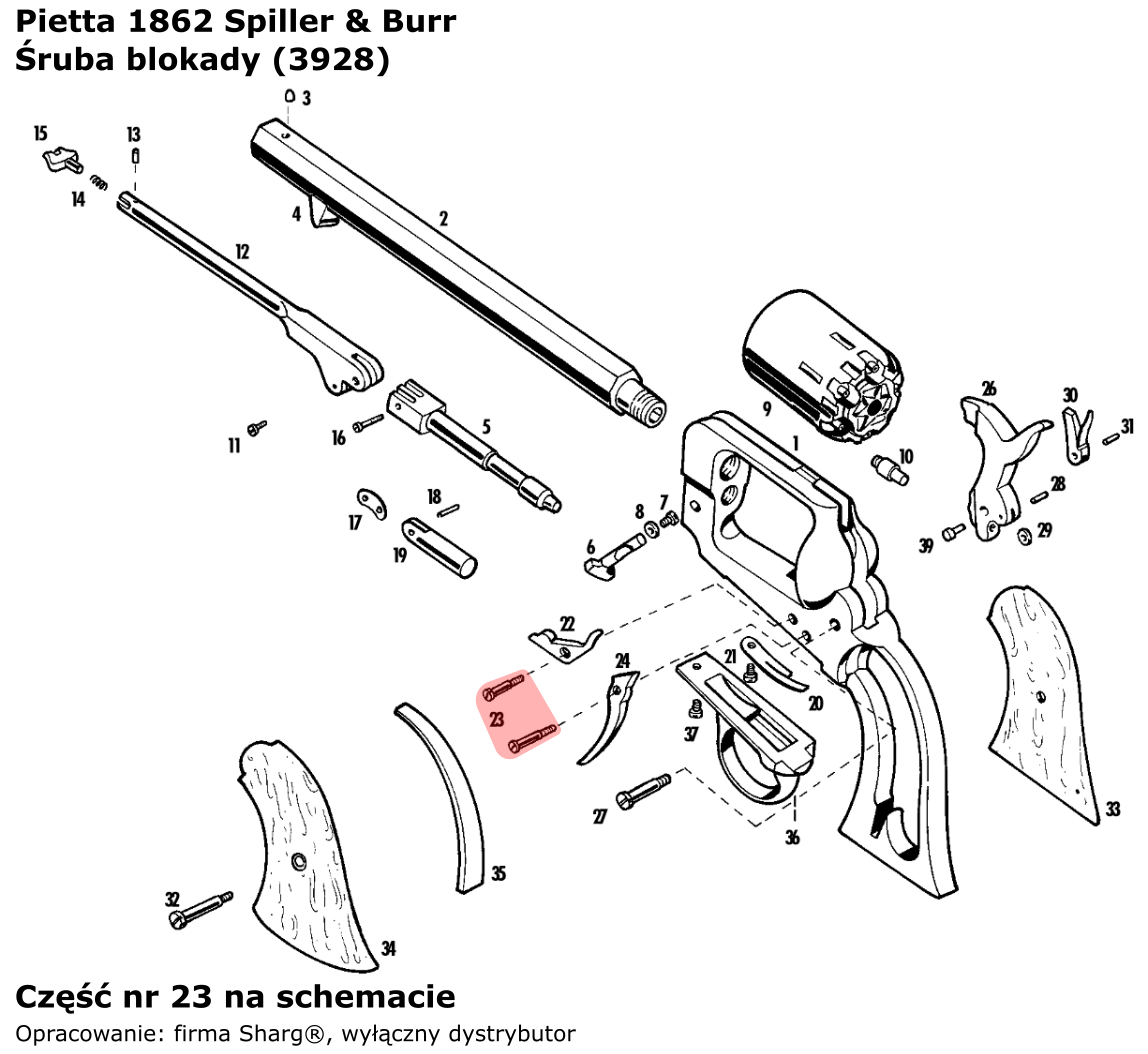 - 3928 (serwis) śruba blokady bębna firmy Pietta. Zaprojektowana do rewolweru czarnoprochowego 1862 Spiller & Burr .36 cal.