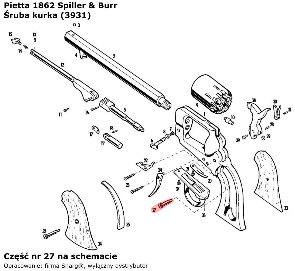 - 3931 (serwis) śruba kurka włoskiej firmy Pietta. Przeznaczona do rewolweru czarnoprochowego 1862 Spiller & Burr .36 cal.