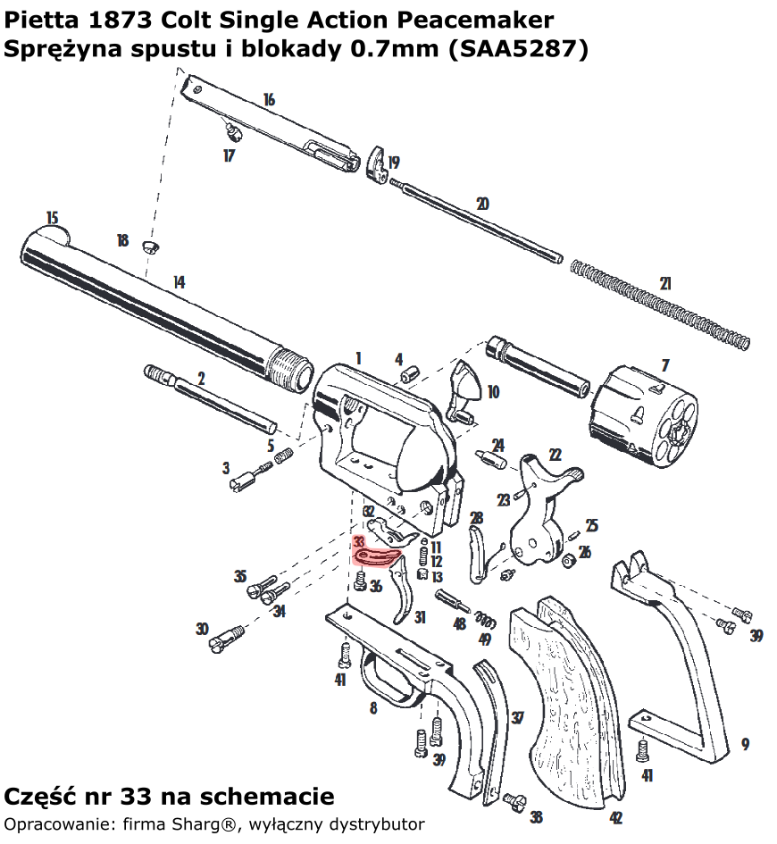 - SAA5287 (serwis) dwupalczasta sprężyna spustu i blokady bębna (0,7 mm) włoskiej firmy Pietta. Do rewolwerów czarnoprochowych 1873 Single Action Steel oraz 1873 Single Action Stainless...