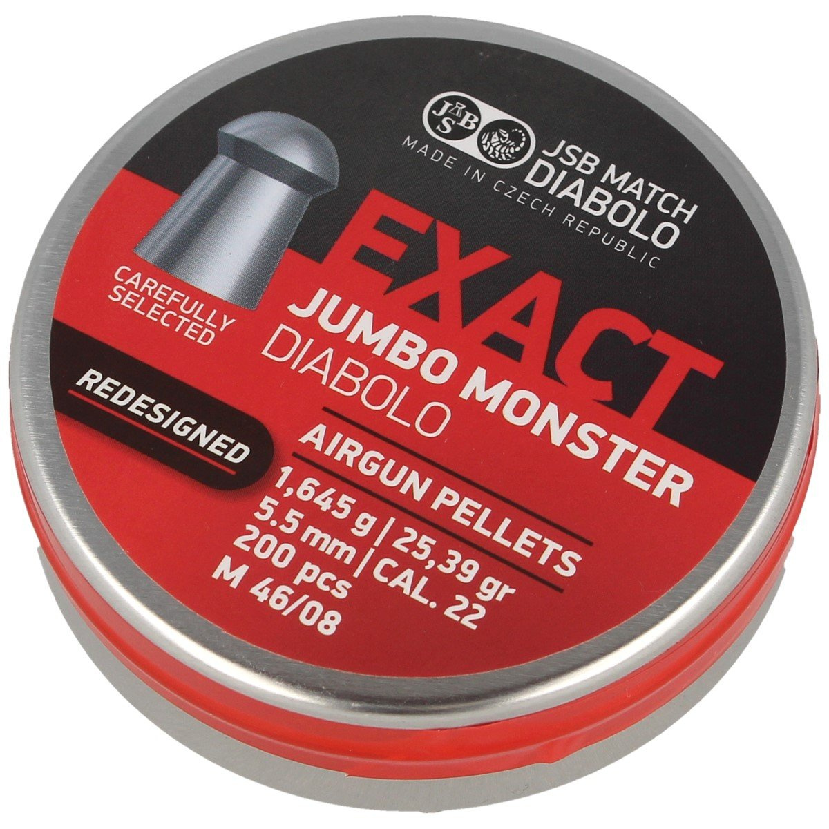 Diabolo Exact Jumbo Monster ReDesigned .22 dzięki nowemu kształtowi uzyskano lepszą precyzję oraz celność śrucin. Najcięższy ze śrutów Exact Jumbo oferowanych przez firmę JSB. Nadkalibrowy śrut typu Round (zaokrąglony), w kalibrze 5.52 mm. Wagę śrutu dobrano tak, że pasuje do karabinów pneumatycznych o największej mocy (FAC broni pneumatycznej) sprężynowych oraz PCP dostępnych na rynku. Mimo wysokiej wagi, uzyskano stabilny tor lotu pocisku przy 50 J+, jak i przy mocnych wiatrówkach o energii 70 J+. Uważany za numer 1 przez posiadaczy wiatrówek FAC.