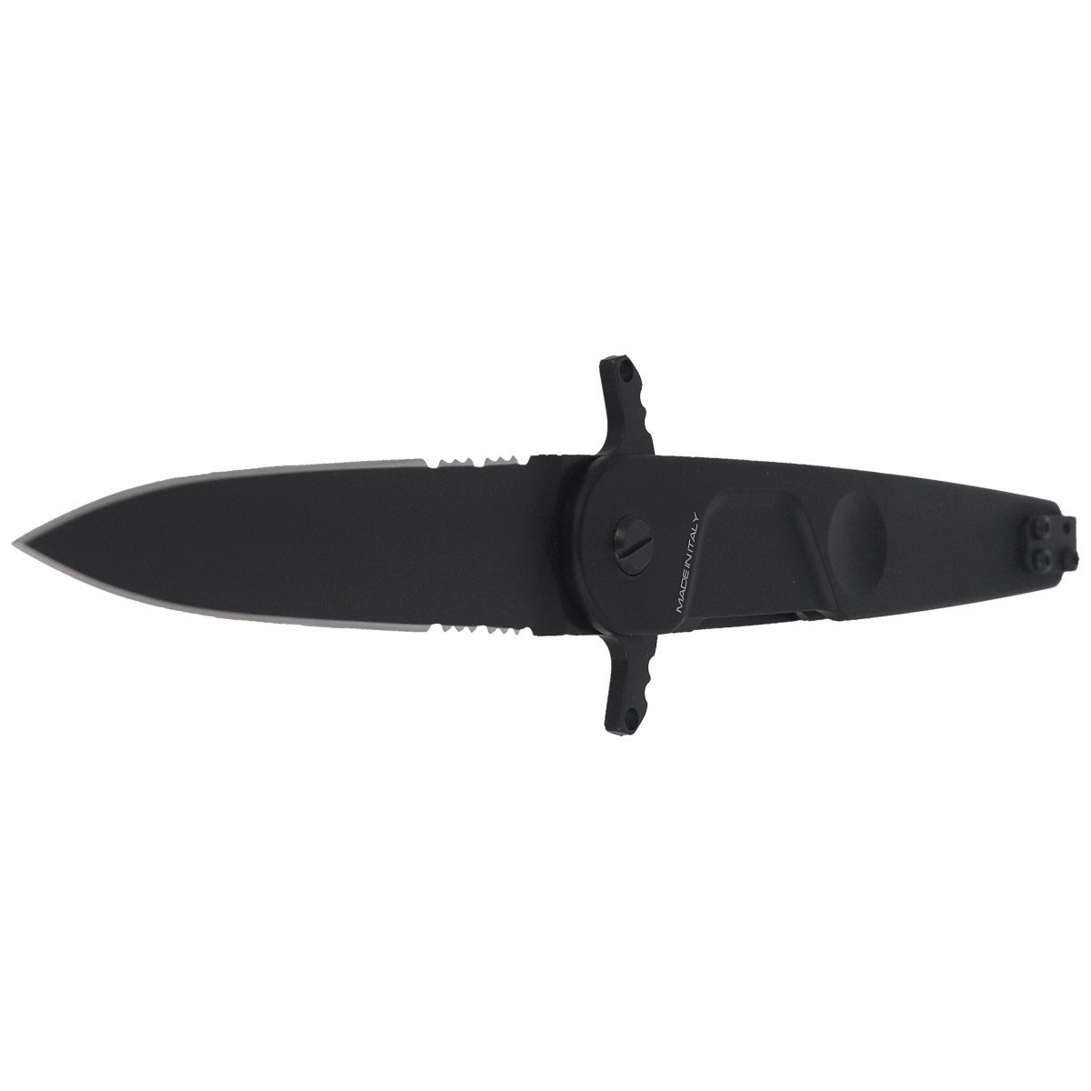 Głownia - smukła, niezwykle ostra o profilu Leaf-Shaped (kształt liścia) z obusiecznym symetrycznym ostrzem, zapewnia doskonałą geometrię krawędzi tnącej przy niskim tarciu. Boki klingi z krótką piłą do agresywnego cięcia. Pokryta matową nierefleksyjną powłoką MIL-C-13924 BURNISHING. Obustronne gładkie ostrze Plain wyprowadzone szlifem płaskim (Flat Grind) zapewnia wytrzymałość oraz ekstremalną wydajność cięć i penetracji. Solidny mechanizm Liner-Lock. Obustronny (double guard) karbowany jelec do szybkiego otwarcia klingi oraz ochrony dłoni.