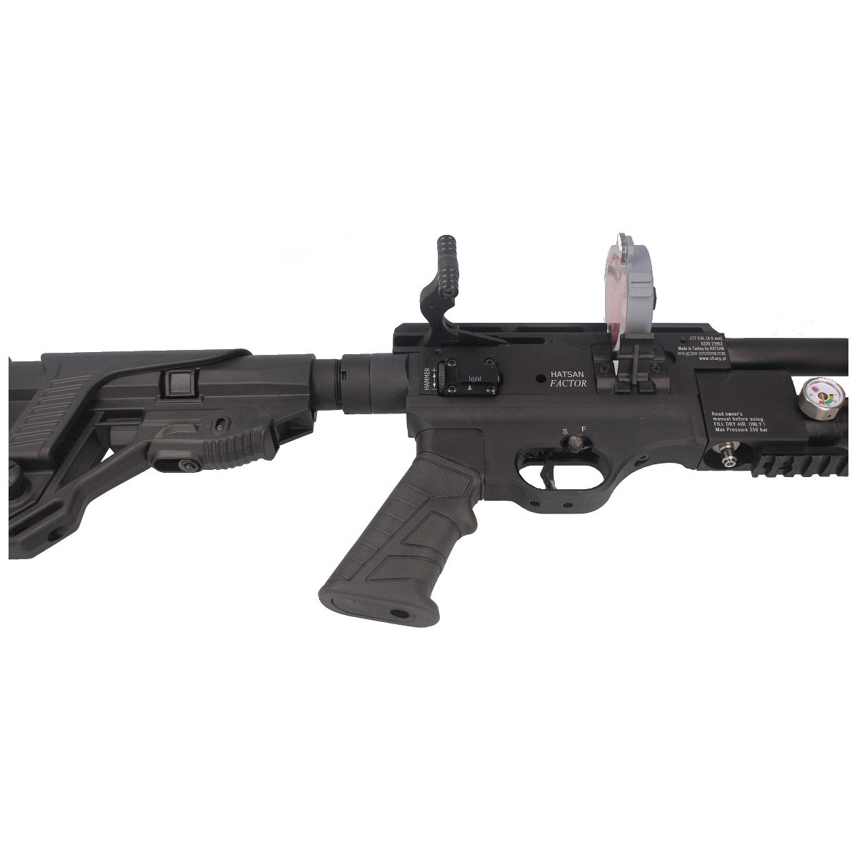 - Factor potężny karabin PCP od Hatsan. Wyposażony w dźwignię napinania Side Lever, regulator mocy strzału, pokrętło regulacji mechanizmu spustowego, lufę ze zintegrowanym tłumikiem dźwięku QE. Dostępny w kalibrach .177 (4.5 mm), .22 (5.5 mm), .25 (6.35 mm)
