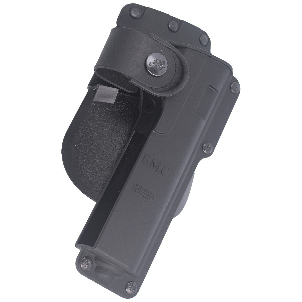 EMC (Paddle) mocowana na pas, zewnętrzna taktyczna kabura typu OWB (Outside the Waist Band) z serii EM firmy Fobus. Seria EM została zaprojektowana do pistoletów wyposażonych w akcesoryjną podlufową szynę montażową. Niski profil ułatwia ukrycie broni, zwiększając komfort przenoszenia. Kabura dobrze zabezpiecza przed uszkodzeniem, nie ma tendencji do przemieszczania się. Wykonana w całości z 100% formowanego wtryskowo polimeru. Model dla praworęcznych.