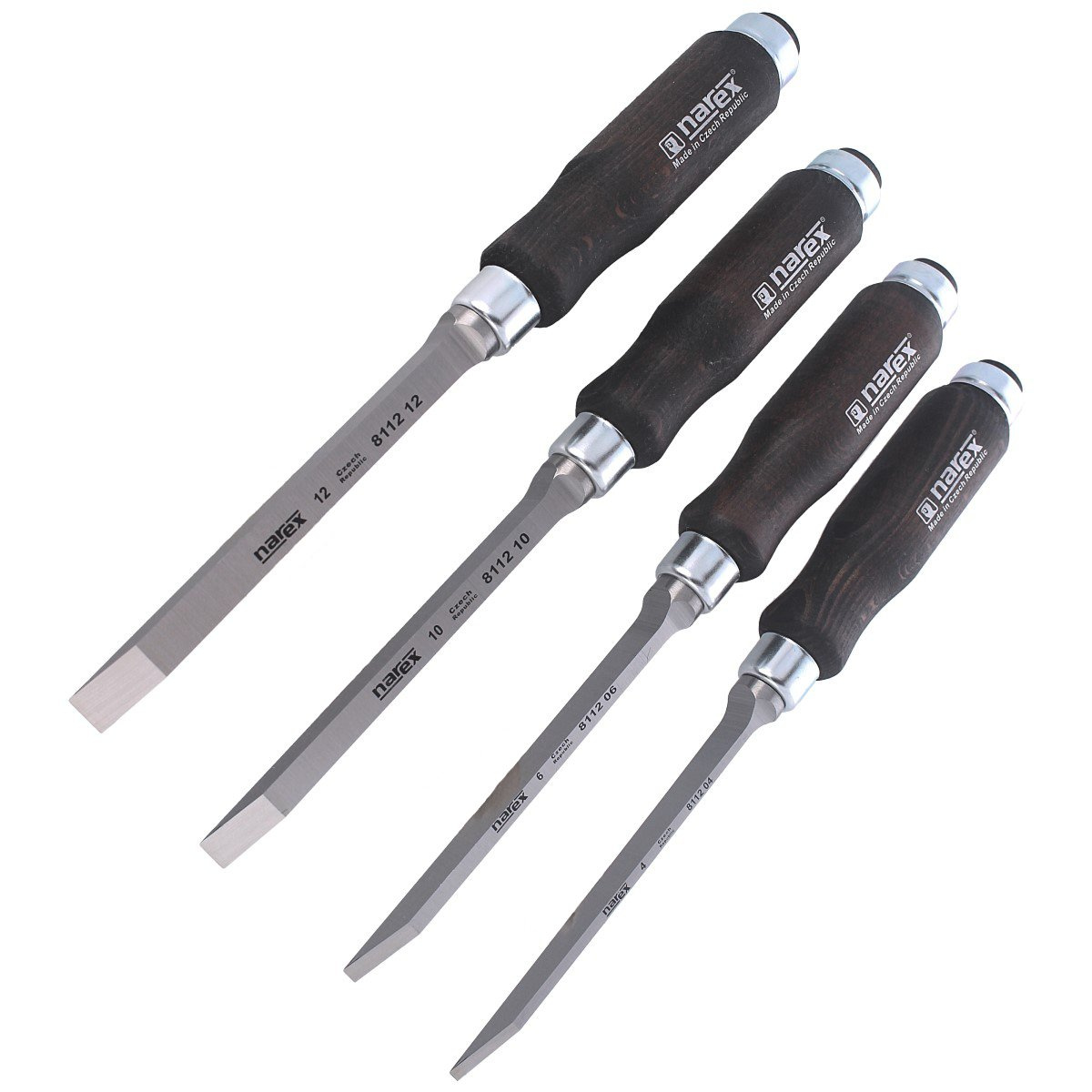 863600, 4-ro elementowy zestaw masywnych dłut gniazdowych z serii Narex Profi, przeznaczonych do ciężkich prac stolarskich i ciesielskich. Do głębokiego dłutowania oraz wykonywania otworów dla połączeń ciesielskich i stolarskich. Zbieżny kształt ostrzy zapobiega klinowaniu się dłut podczas pracy.