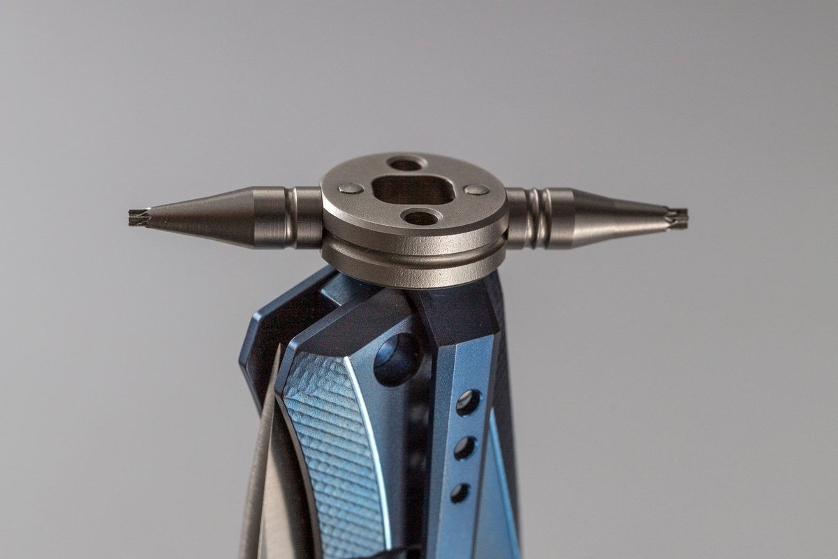 Multi Tool przydatny do regulacji i konserwacji noży, pozycjonowania i stabilizacji głowni, zdejmowania okładzin rękojeści, odkręcania / dokręcania: płetwy flippera, dysku Thum Stud, klipsa.