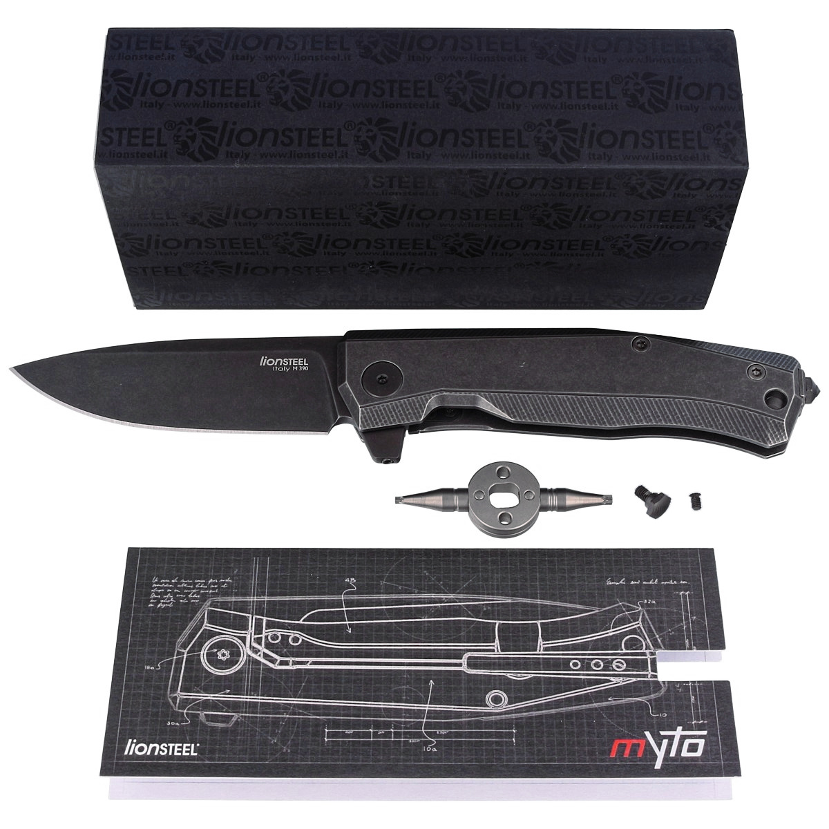 Myto Old Black Titanium, PVD + Stone Washed zaawansowany technicznie folder Hi-Tech z wytrzymałą blokadą frame-lock i okładzinami w kolorze Old Black, wykończenie metodą starzenia powłoki tytanowej. Wyjątkowy nóż E.D.C. włoskiej manufaktury LionSteel. Wyposażony w ostrze ze stali spiekanej M390, umieszczoną na spodzie głowni płetwę „ReF”, system łożysk kulkowych Double Crown oraz tytanowy klips. W zestawie LionSteel Hand (#HY 68), klucz do regulacji śrub Torx T6, Torx 8 wraz z sześciokątnym kluczem Hex do śruby zbijaka szyb.