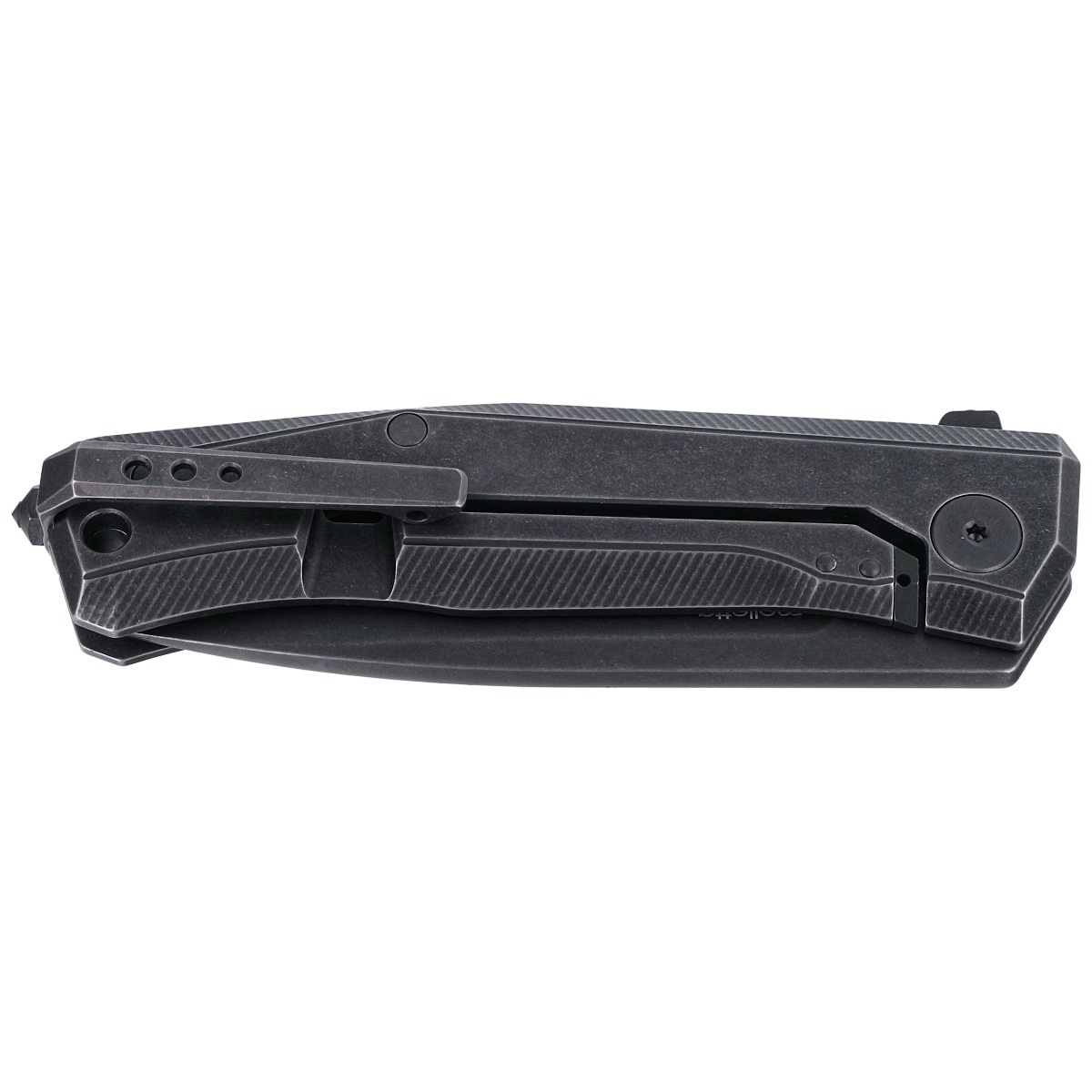 Rękojeść - okładziny w kolorze old black z podwójnie frezowanego litego tytanu 6AI-4V, zamocowano do tytanowej przekładki dystansowej tzw. backspacera / łącznika okładzin. Tytanowy Solid® klips pozwala przenosić nóż w pozycji tip-up (czubkiem do góry). Klips przykręcono do tytanowej ramy za pomocą śruby /zbijaka do bicia szkła wykonanej z węglika wolframu. W tylnej części okładzin lanyard hole, otwór na linkę.