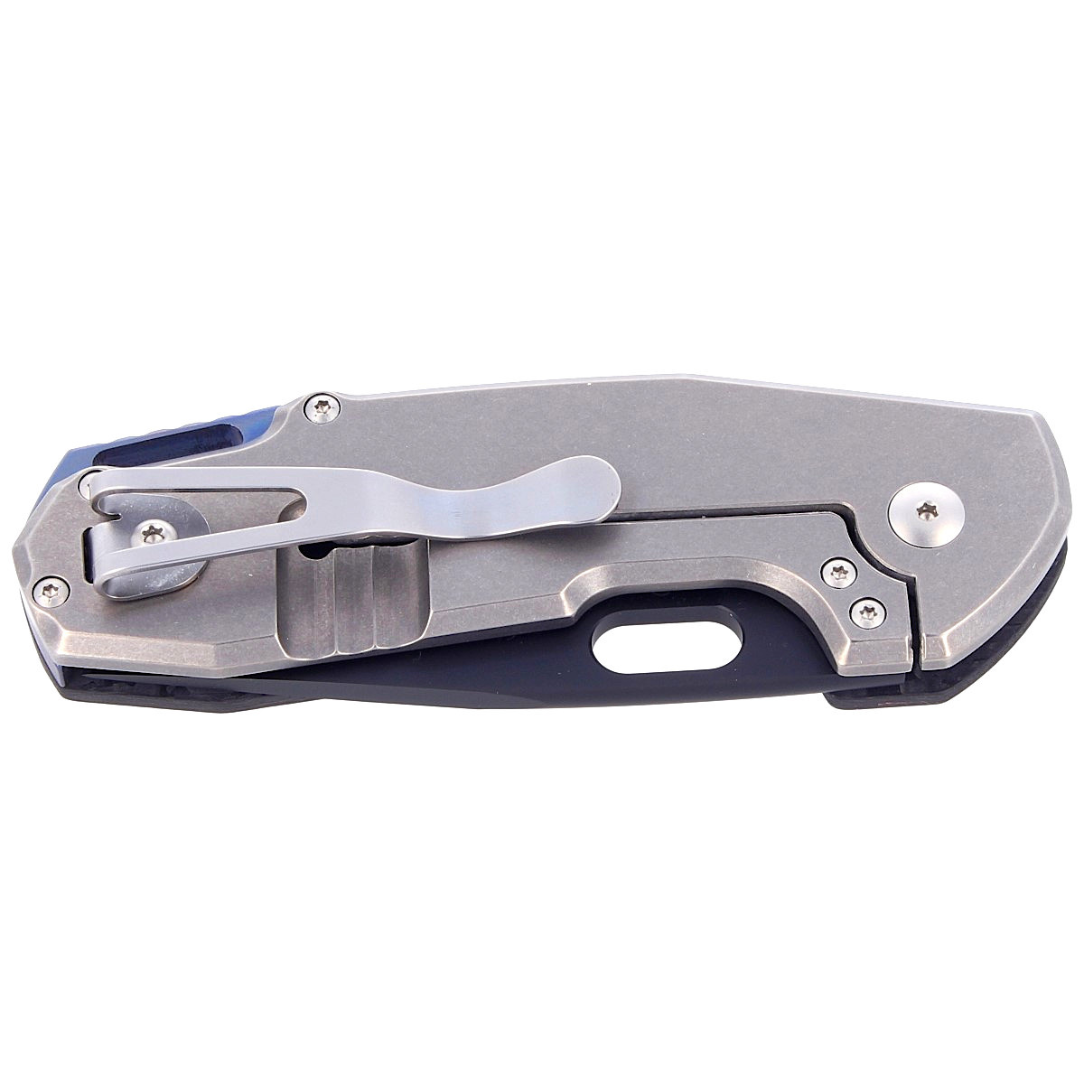 Rękojeść - z jednej strony gruby kawałek czarnego Carbon Fiber (włókno węglowe prasowane pod ciśnieniem z żywicą syntetyczną), a z drugiej okładzina z litego tytanu. Okładki przykręcono do frezowanego obrabiarkami CNC anodyzowanego na niebiesko wykonanego z tytanu backspacera, co oznacza praktycznie niezniszczalność takiej konstrukcji. Prawo i lewostronny, dwupozycyjny głęboki klips deep carry, pozwala przenosić dyskretnie nóż w pozycji tip-up (czubkiem ostrza do góry). Na końcu rękojeści lanyard hole, otwór na linkę.
