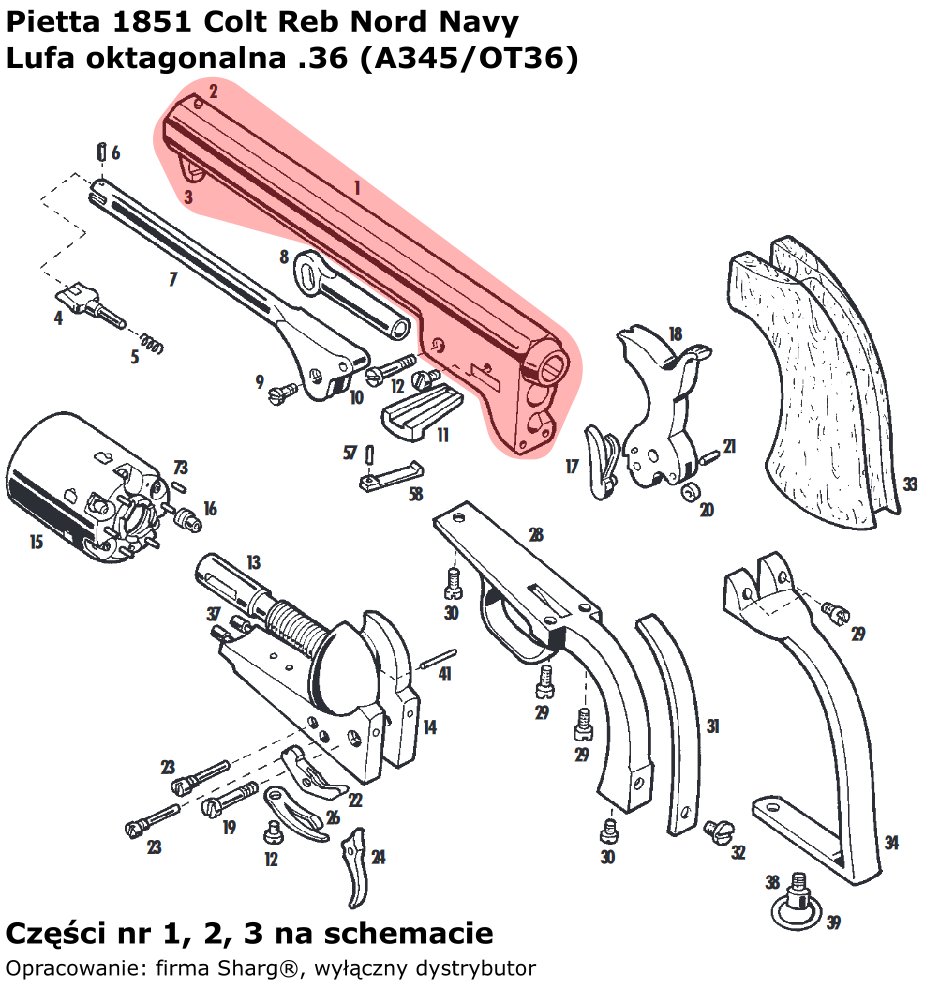 • A345/OT36 (serwis) lufa gwintowana kal. .36 do rewolwerów czarnoprochowych 1851 Colt REB Nord Navy firmy Pietta. Oktagonalna o długości 7.5", oksydowana na czarno. Wyposażona w przyrządy celownicze, front sight (#404) oraz mocowanie dźwigni stempla (#676)