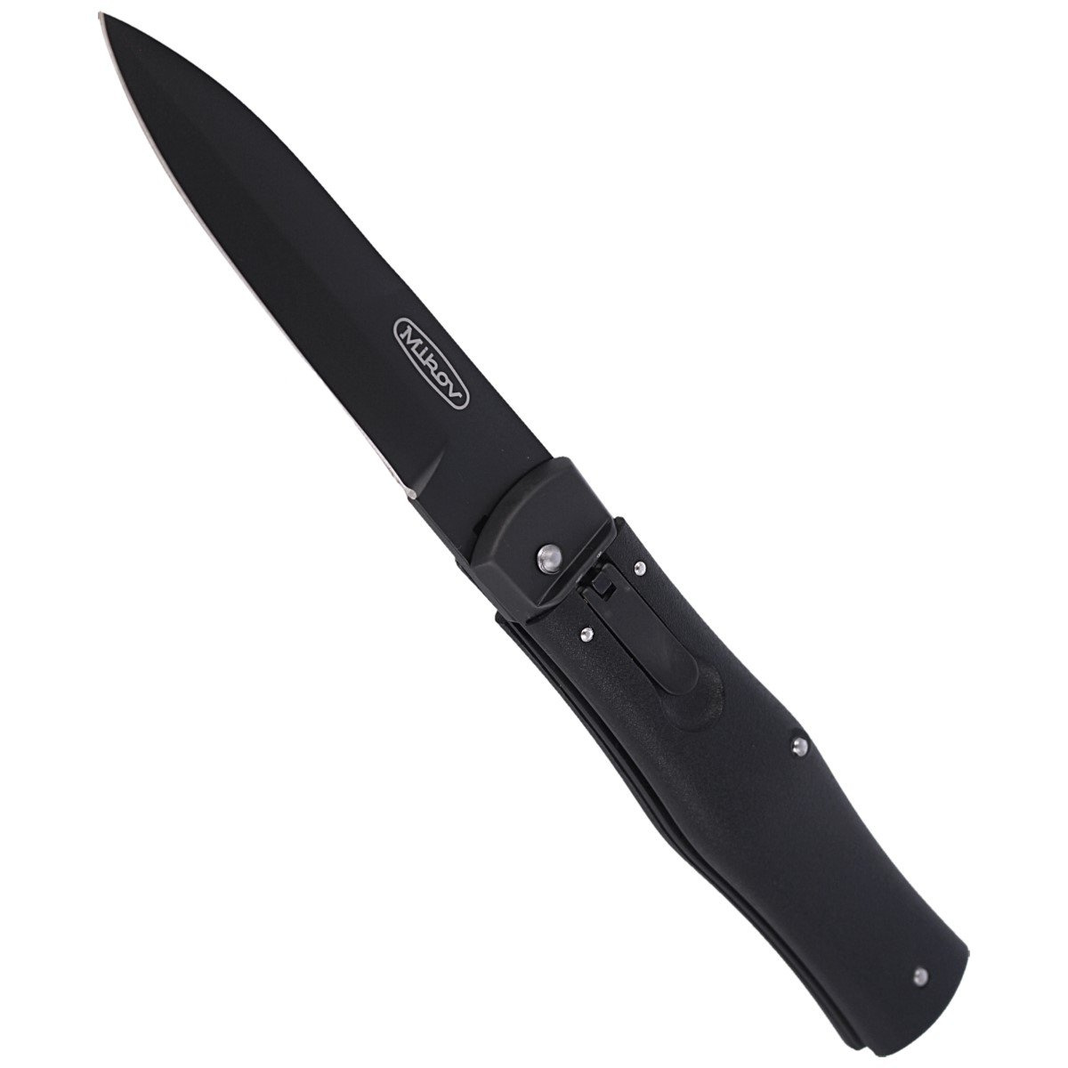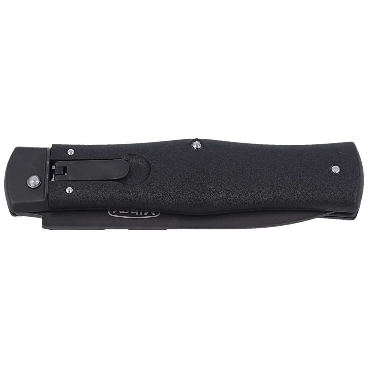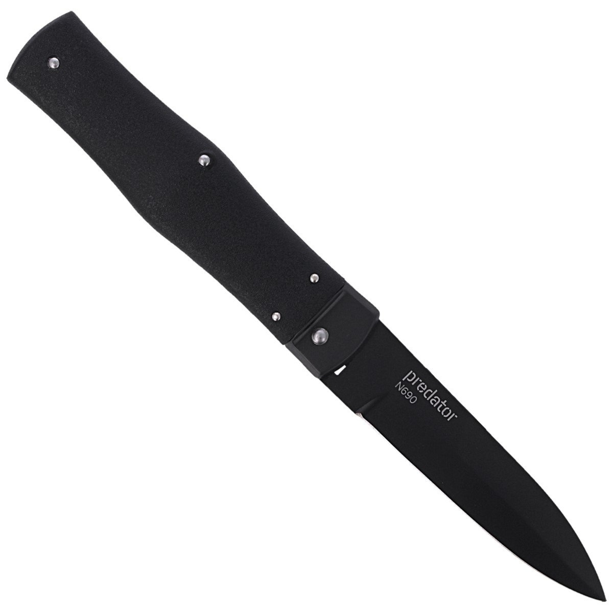 Predator Blackout, Black ABS, Black DLC nóż automatyczny (swichblade) czeskiej firmy Mikov z Mikulasovic klingą ze stali N690, pokrytą czarną powłoką DLC. Region ten od 1794 roku specjalizuje się w produkcji wyrobów nożowniczych, będąc nazywanym "czeskim Solingen".