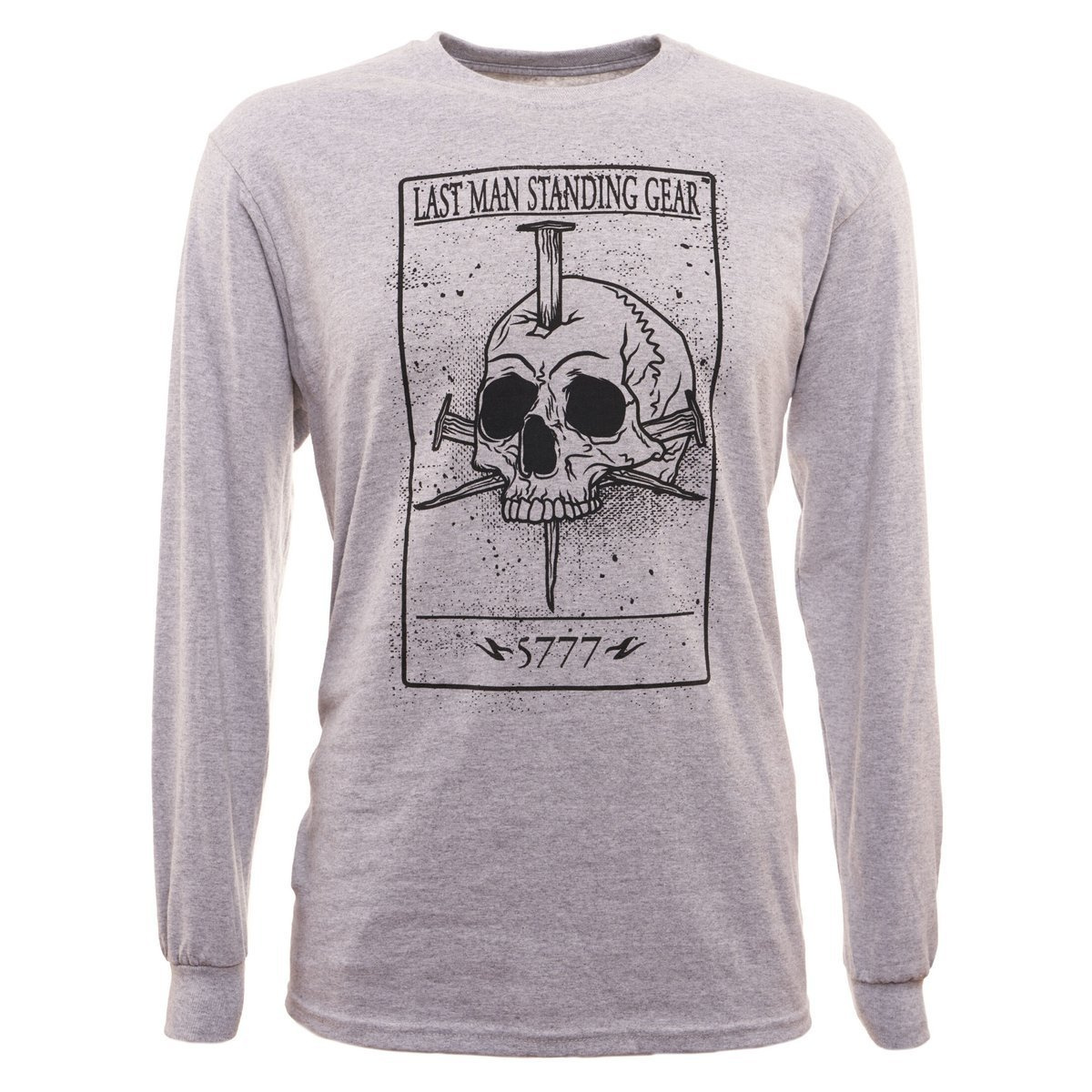 - Death Card Skull wygodna, luźna taktyczna koszulka z długim rękawem firmy LSM Gear z nadrukiem. Motywem "Karty śmierci" z czaszką i trzema rzymskimi gwoździami z przodu oraz nadrukiem LMS Gear z tyłu. Idealna jako warstwa podstawowa na chłodniejsze dni.