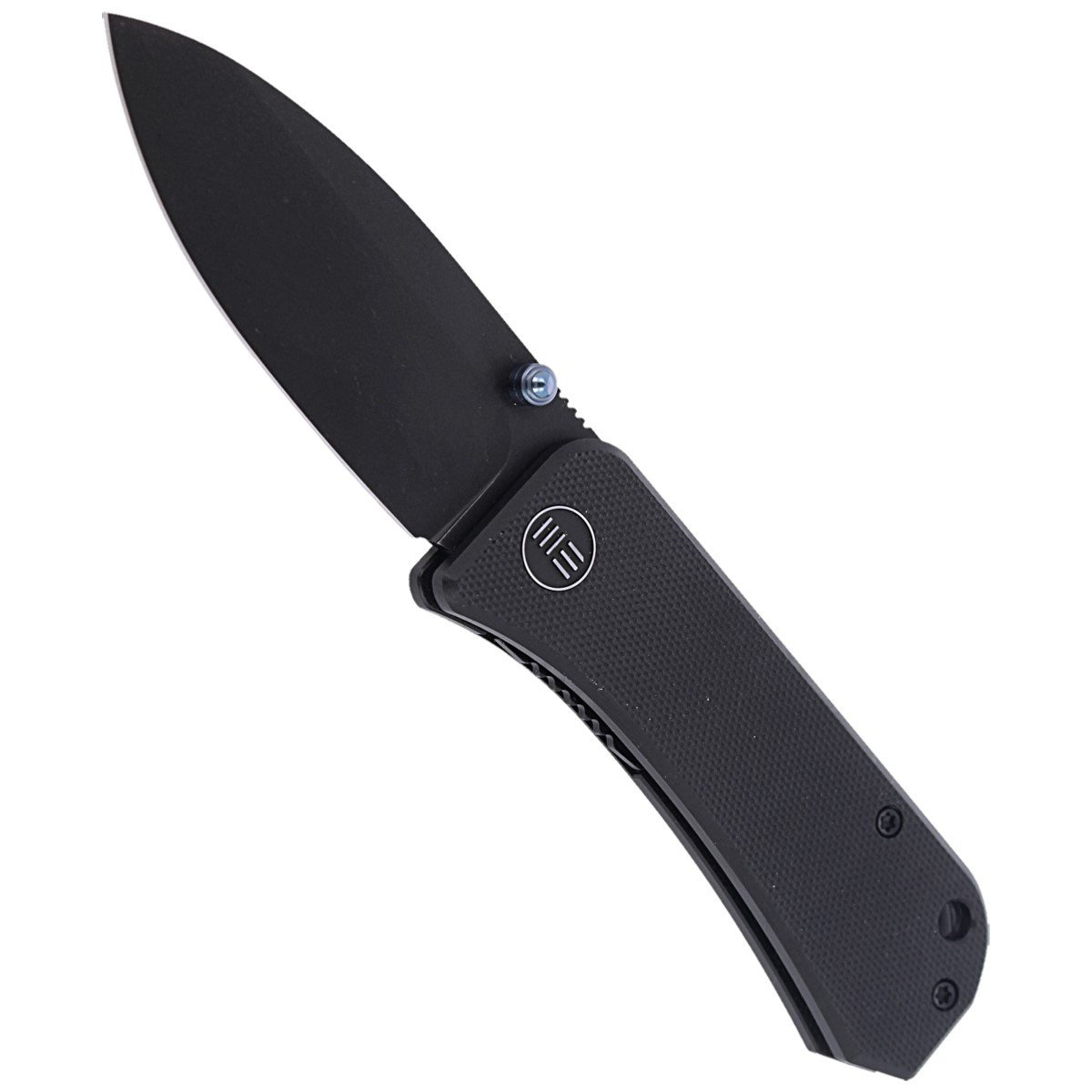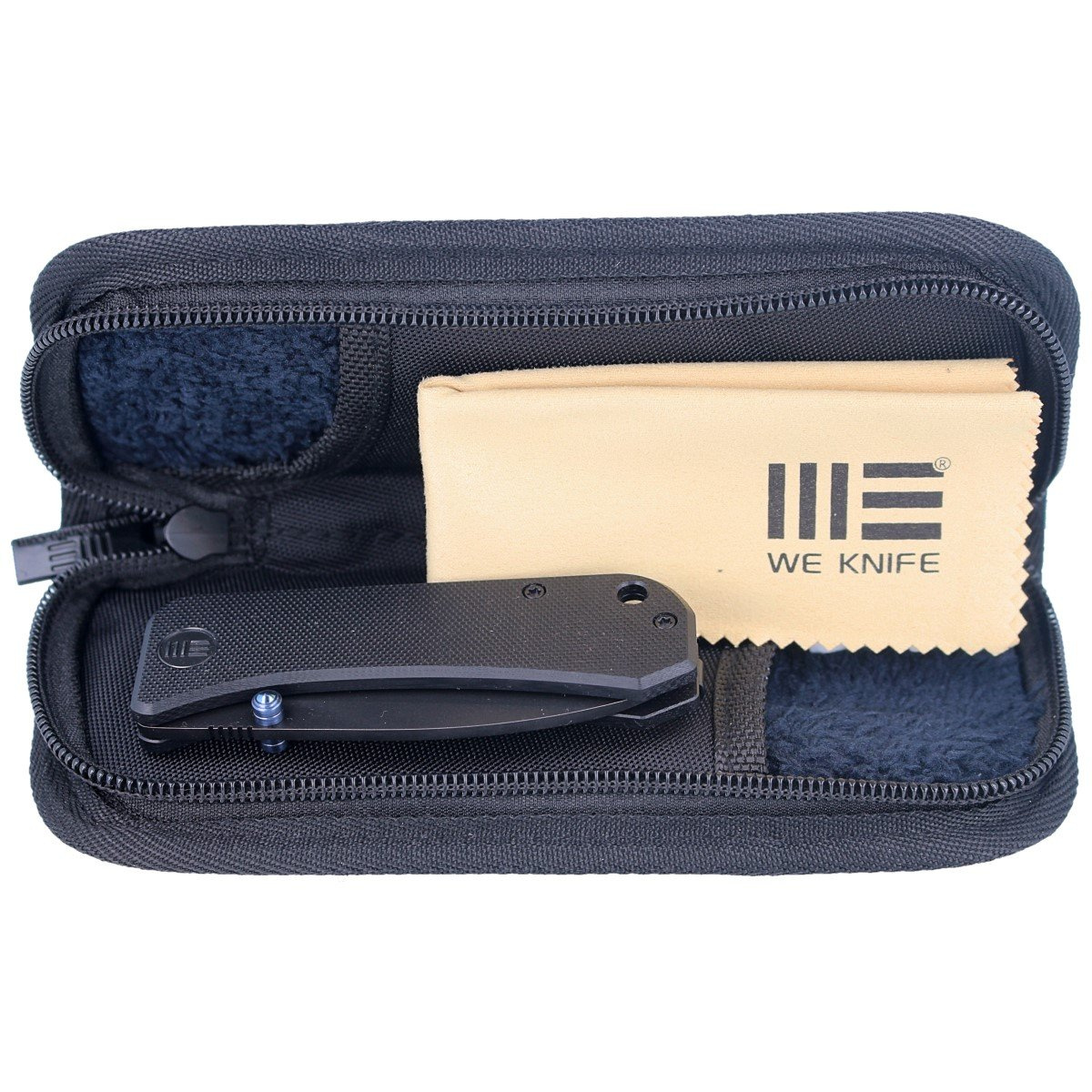 Rękojeść - moletowane czarne kawałki tworzywa G10. Otwarta konstrukcja tzw. open-backed mocowana do siebie stalowymi tulejami dystansowymi zmniejsza wagę oraz ułatwia czyszczenie. Oś pivota zdobi stylizowane logo marki WE. Prawostronny, jednopozycyjny metalowy klips deep carry pozwala przenosić dyskretnie nóż w kieszeni w pozycji tip-up (ostrzem do góry). Z tyłu rękojeści lanyard hole, otwór na linkę.