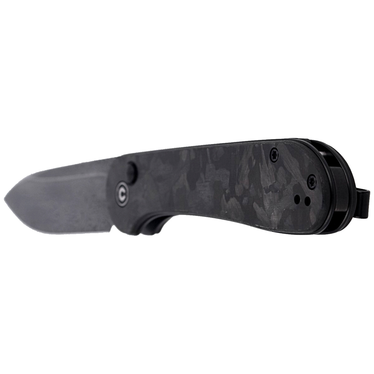 Rękojeść - z kompozytu włókna węglowego o czarnym marmurkowym wzorze Marble Carbon Fiber Black. Fazowane krawędzie okładzin eliminują ostre krawędzie dla wygody i pewności uchwytu. Całość mocowana do linersów ze stali nierdzewnej. Prosta, solidna konstrukcja daje pewność wieloletniego użytkowania. Czarny backspacer wykonano z tego samego materiału co okładziny. Oś pivota zdobi stylizowane logo marki Civivi. Metalowy obustronny klips deep carry pozwala przenosić dyskretnie nóż w kieszeni w pozycji tip-up (czubkiem ostrza do góry). Na końcu rękojeści, w zagłębieniu backspacera, lanyard hole, otwór na linkę.