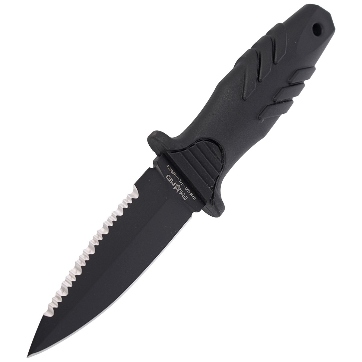 - Tactical Elementum Dagger, kompaktowy nóż dla nurka o konstrukcji full tang włoskiej firmy FOX z klingą ze stali N690Co, pokrytą czarną matową powłoką. Idealne narzędzie do wykorzystania podczas wypraw nurkowych, podwodnego łowiectwa oraz prac na lądzie