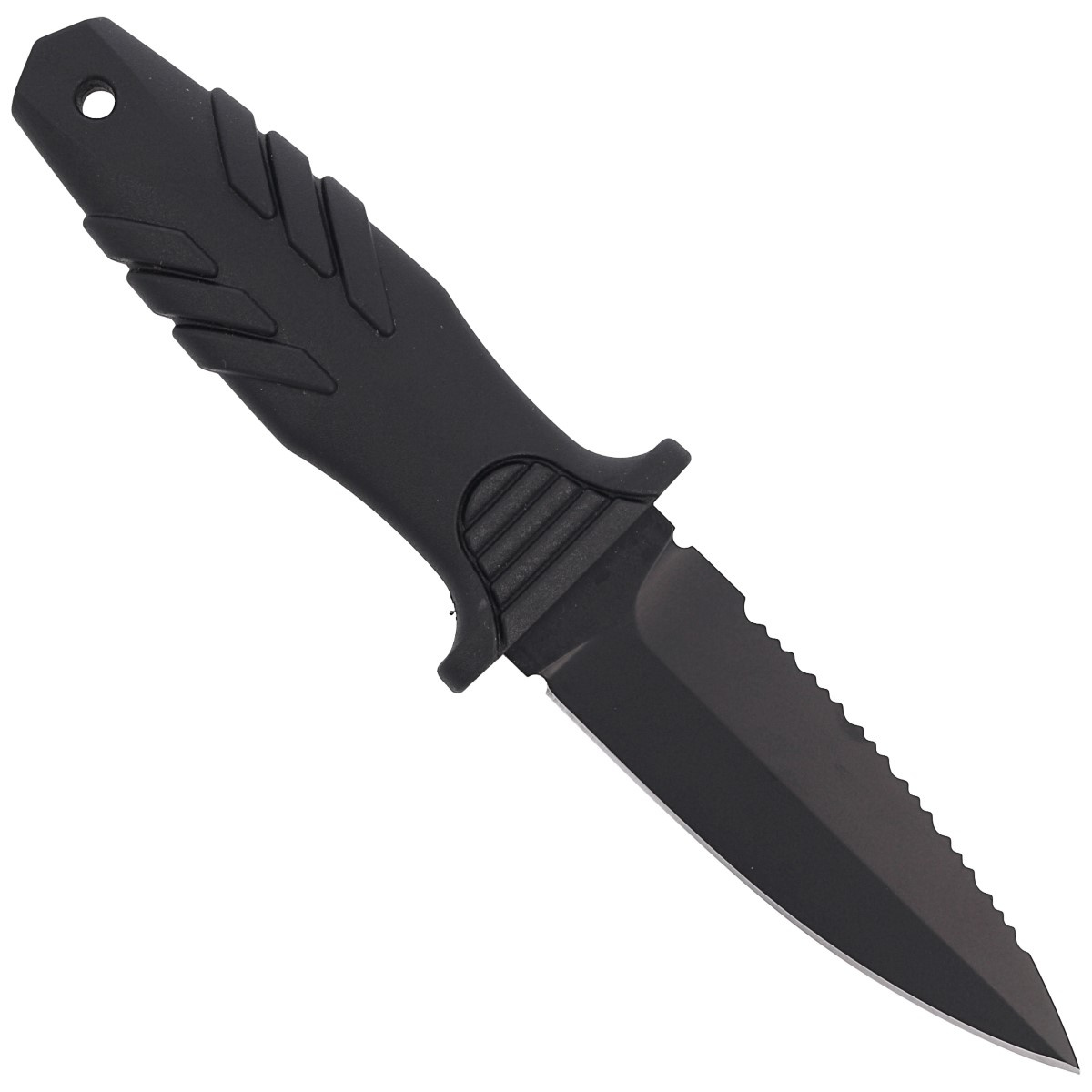 Głownia - Dagger (sztylet), grubości 3 mm. Ostrze obustronne o rewelacyjnych właściwościach tnących wyprowadzono szlifem płaskim (Flat Grind). Jedno z krawędzi w pełni gładka Plain, druga ząbkowane Serrated (do cięcia twardych materiałów, tworzyw sztucznych oraz włóknistych jak liny, sznury, żyłki) zakończone od strony rękojeści oczkiem do rozcinania sieci. Ostrze Serrated (ząbkowane) stosowane w nożach nurkowych, ratowniczych, survivalowych składa się naprzemiennie z jednego dużego oraz trzech małych zębów tzw. three-step. Wzór ten zwiększa długość krawędzi cięcia nawet o 24% w stosunku do ostrza prostego. Idealne do agresywnego cięcia twardych materiałów, tworzyw sztucznych oraz włóknistych jak liny czy sieci.