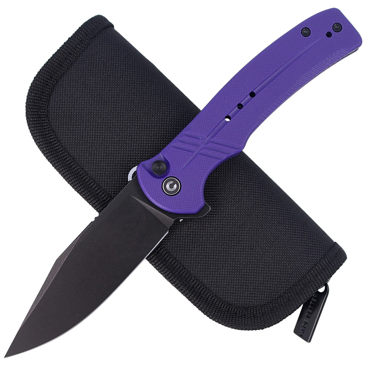 Rękojeść - w kolorze fioletowym. Wykonana z tworzywa G10, włókna szklanego prasowanego pod ciśnieniem z żywicą. Fazowane krawędzie okładek eliminują ostre krawędzie dla wygody, a wykonany z przodu i z tyłu na linersach jimping poprawia pewność uchwytu. Otwarta konstrukcja tzw. open-backed mocowana stalowymi tulejami dystansowymi redukuję wagę oraz ułatwia czyszczenie. Oś pivota zdobi stylizowane logo marki Civivi. Dwupozycyjny, prawo/lewostronny klips deep carry pozwala przenosić dyskretnie nóż w kieszeni w pozycji tip-up (czubkiem ostrza do góry).